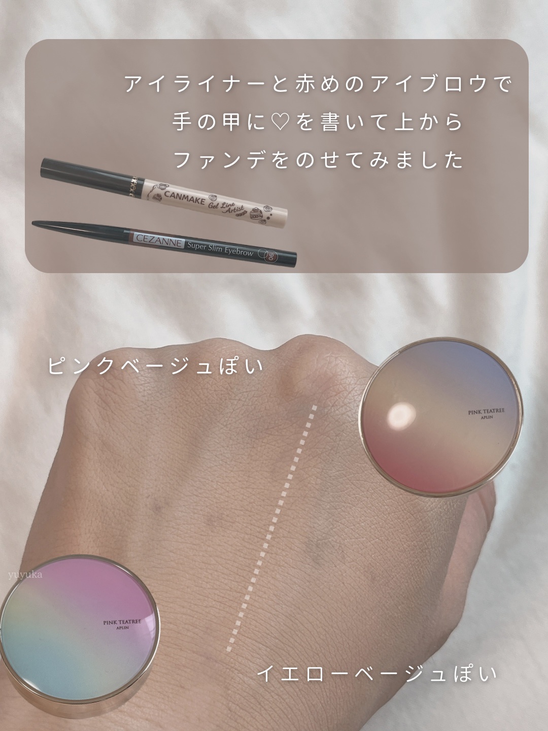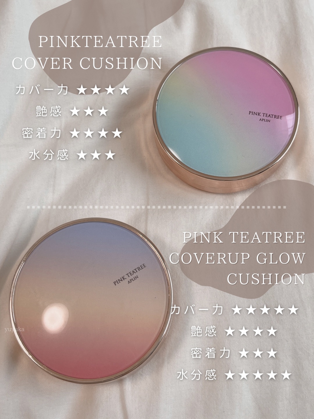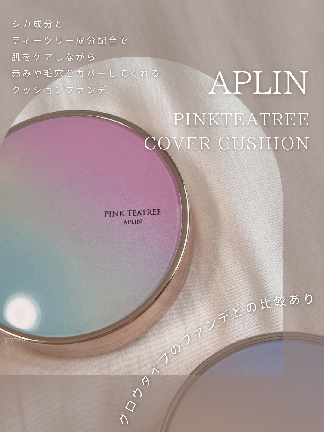 APLIN ピンクティーツリーカバークッション 21号ライトベージュ 2,490円(税込) 少量でよく伸びてハイカバー! 赤みやくすみをしっかりカバ一できるのに、厚塗り感のないなめらかな仕上がり♡ ハイカバーなのにナチュラルなツヤ感とサラッとしつつ、乾燥崩れしにくい仕上がりに感動します!!