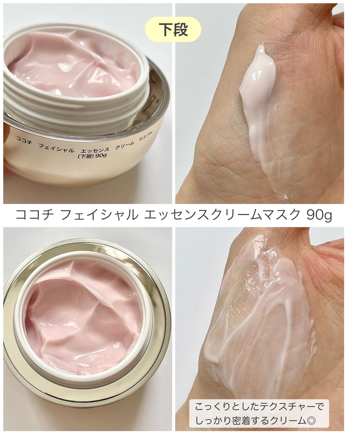 - 水分クリームマスク。クリームとマスクの2ステップで、それぞれに配合された美容保湿成分をお肌に与えます。いつものお手入れに加えるだけで、これまでにはなかったエイジングケア*を。*年齢に応じたお手入れ クリームマスク 90g(下段)/クリーム 20g(上段) 販売名:ココチ フェイシャル エッセンス クリームマスク ココチ リッチ エッセンス クリーム