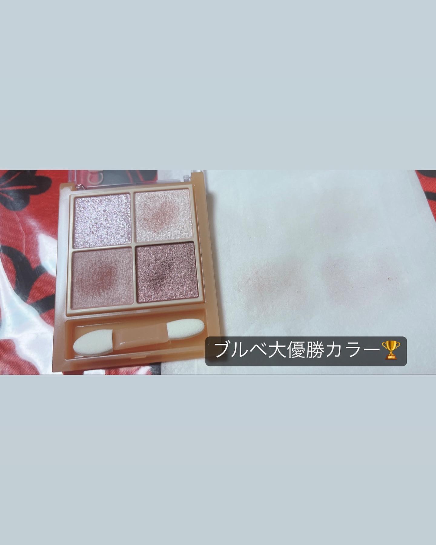 - ラメ・パール・マット3質感の4色アイシャドウ。 肌馴染みの良いベージュを基調としたカラー。ラメ・パール・マットの3質感を重ねて、自然にまぶたを強調し奥行のある大きな目元へ。 しっとり溶け込むような柔らかなパウダーなので、スルスル伸びてまぶたにピタッと密着。保湿成分(スクワラン・ホホバ種子油)配合。