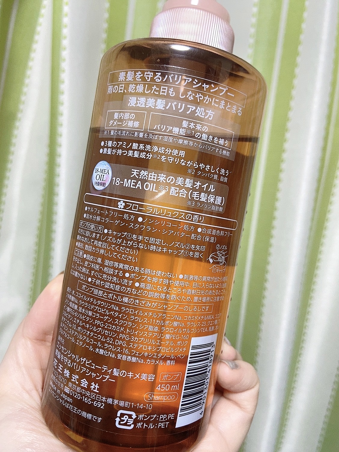 - うる髪続くバリアシャンプー・コンディショナー 雨の日、乾燥した日も しなやかにまとまる 【バリアシャンプー・コンディショナー共通】 ●浸透美髪バリア処方 ・髪内部のダメージ補修 ・ 髪本来のバリア機能*の働きを補う *髪の毛流れに変化を及ぼす湿度・摩擦等からバリアする機能 ●天然由来の美髪オイル 18-MEA OIL*配合(毛髪保護)*ラノリン脂肪酸 ●サルフェートフリー処方 ●合成着色料フリー ●加水分解コラーゲン・スクワラン・シアバター配合(保湿) ✿フローラルリュクスの香り 【バリアシャンプー】 ●3種のアミノ酸系洗浄成分使用 ●とろふわスフレ泡で素髪が持つ美髪成分*を守りながらやさしく洗う *タンパク質、脂質 ●ノンシリコーン処方 【バリアコンディショナー】 ●傷んだ髪を集中補修&コート ●湿度や摩擦等の外部刺激から髪を守る ●セラミドES*配合(補修)*ビスメトキシプロプルアミドイソドコサン