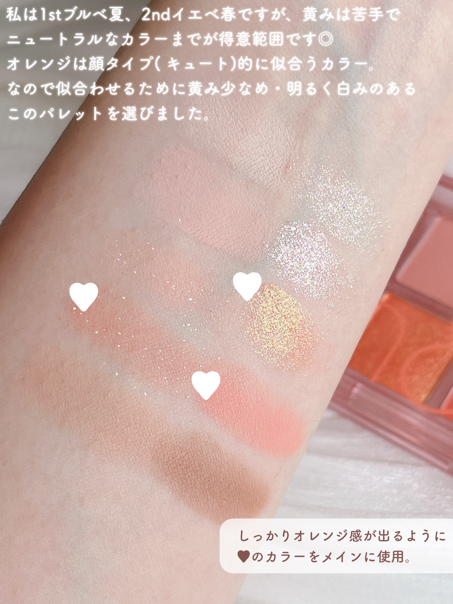 めちゃめちゃ可愛いし、全部使いやすい色!! ざイエベ春みたいな色なんだけど画面越しでちゃんと伝わってるかな? 発色最強💪とかじゃないから普段も使いやすいと思うし、派手にもできると思う あたしは太陽光に当たってる時のキラキラしたオレンジが推しです🧡✨