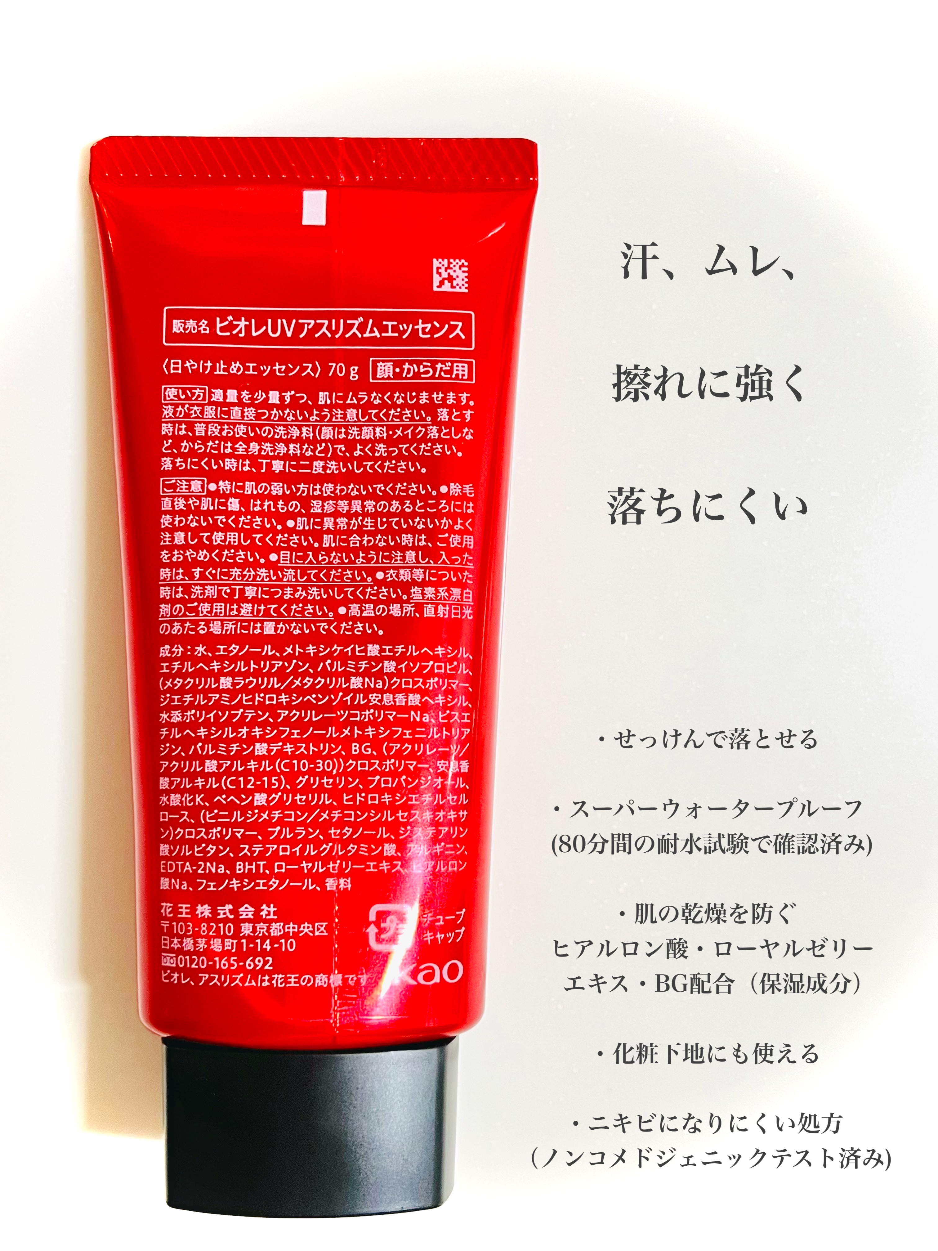- 過酷な環境*1にも耐える、最高クラス*2UV。 高温多湿環境で落ちにくさを確認。汗・擦れに強く落ちにくい「タフブーストTech」採用。 肌になじんだ後に“なめらかな肌感触”に変わる、モイストタッチエッセンス。 肌の乾燥を防ぐヒアルロン酸・ローヤルゼリーエキス・BG配合(保湿成分)。 ◆SPF50+/PA++++ ◆スーパーウォータープルーフ(80分間の耐水試験で確認済み) ◆せっけんで落ちる ◆化粧下地にも使える ◆ホワイトフローラルの香り(天然香料配合) ◆にきびになりにくい処方(ノンコメドジェニックテスト済み*3) *1 高温多湿環境(40℃、湿度75%) *2 ビオレUVシリーズ内における、UVカット効果(SPF50+ PA++++)および、高温多湿環境での塗膜の落ちにくさ *3 すべての方にコメド(ニキビのもと)ができないというわけではありません。