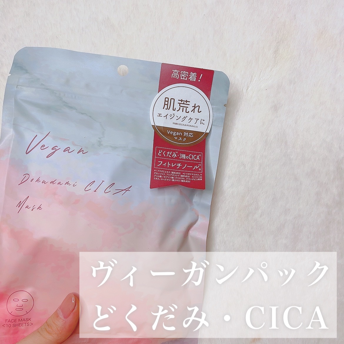 - どくだみ×3種のCICA*1に加え、植物由来の次世代のエイジングケア※成分・フィトレチノール*2を新配合。 よりピタッと密着するマスクに改良し、乾燥や肌荒れを防ぎながらエイジングケア※できるヴィ―ガンマスクです。 7種*3の精油をブレンドした香りがお肌に広がります。 *1 ツボクサエキス、アシアチコシド、マデカッソシド *2 トリ(カプリル酸/カプリン酸)グリセリル、オランダビユ果実エキス、ローズマリー葉エキス(整肌成分) *3 ローズマリー葉油、ローマカミツレ花油、ラベンダー油、ユーカリ葉油、ニオイテンジクアオイ油、オニサルビア油、エンピツビャクシン油(香り成分) ※1 年齢に応じたお手入れのこと