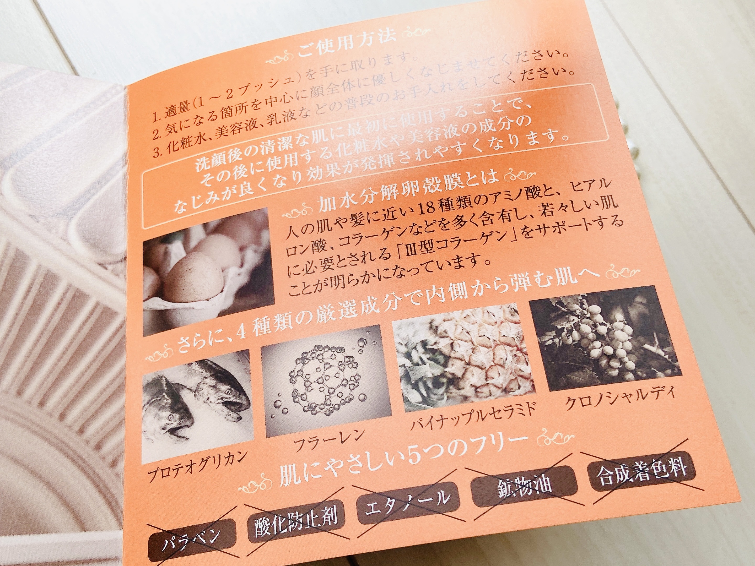- 卵殻膜をはじめ、プロテオグリカン、フラーレン、パイナップルセラミド、クロノシャルディー、スクワランなどの美容保湿成分を配合しており、赤ちゃんのようなふっくら*とした肌を目指したい方におすすめの導入美容液です。 洗顔後の素肌になじませることでダイレクトにはたらきかけ、潤いや艶、ハリを与えてくれるだけでなく、化粧水やクリームの成分の浸透*をサポートし、特別なお手入れに。卵殻膜エキス**95%配合だからこそ出てしまう素材特有のたまご臭さを感じにくいやさしい薔薇の香りに仕上げました。 *角質層まで **保湿成分