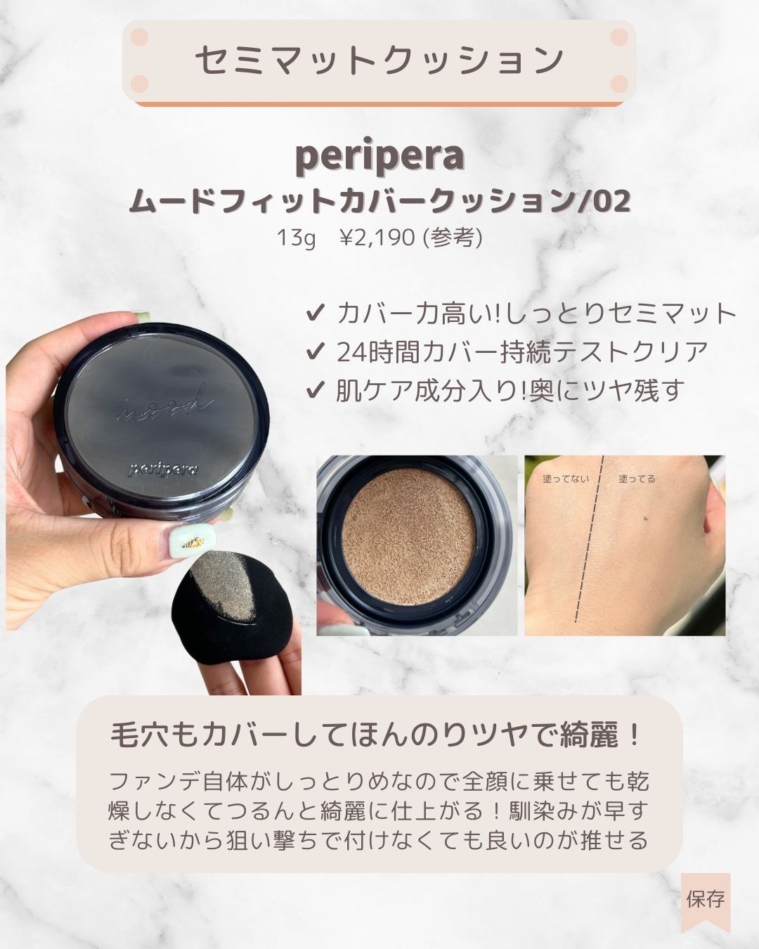 唯一の失敗はペリペラのクッションが02の21号だと明るくて顔が浮く🤣ので普段21号〜23号の間の色が合う方は03の23号でも割とトーンアップして良さそうです🫶🏻 私は目の下のくすみ、鼻筋のトーンアップに部分使いすると良い感じなので02も活用中です😚💕 夏でも朝でも関係なくベタベタに保湿したい派なので、スキンケアで仕込んだツヤを生かしつつ、テカリに見えないセミマットが好みなので夏はマット系ファンデが好き♡