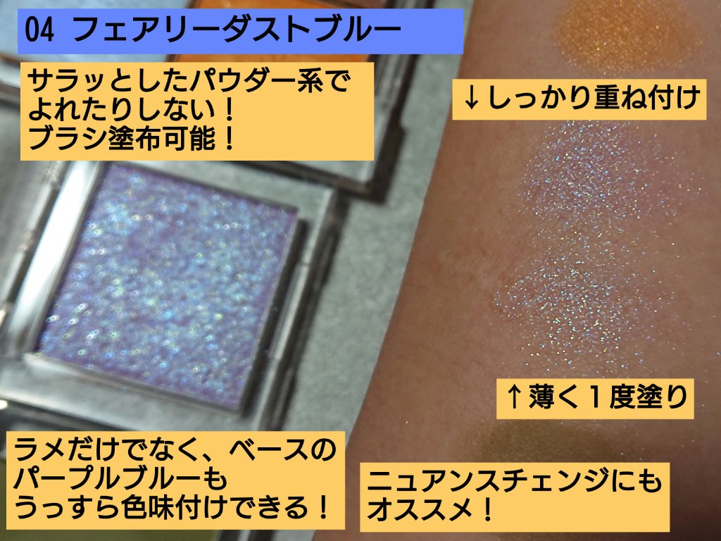 チークもアイシャドウも、ブラシでおもいっきりガリガリ削って、べったり付けなきゃ発色してくれない。 ニュアンスチーク感覚で、余白は埋まらない。 チークレスが好きな方。チーク失敗したくない方。別なチークをぼかす要因なら有り。 『F03 ベッドサイド』が全く陰影カラーとして二重幅に入れても発色しないんだわ。 『R06 ターメリック』も、もっと『今日イエローメイクだね!』って気付かれる程アクセントにしたいのに…。