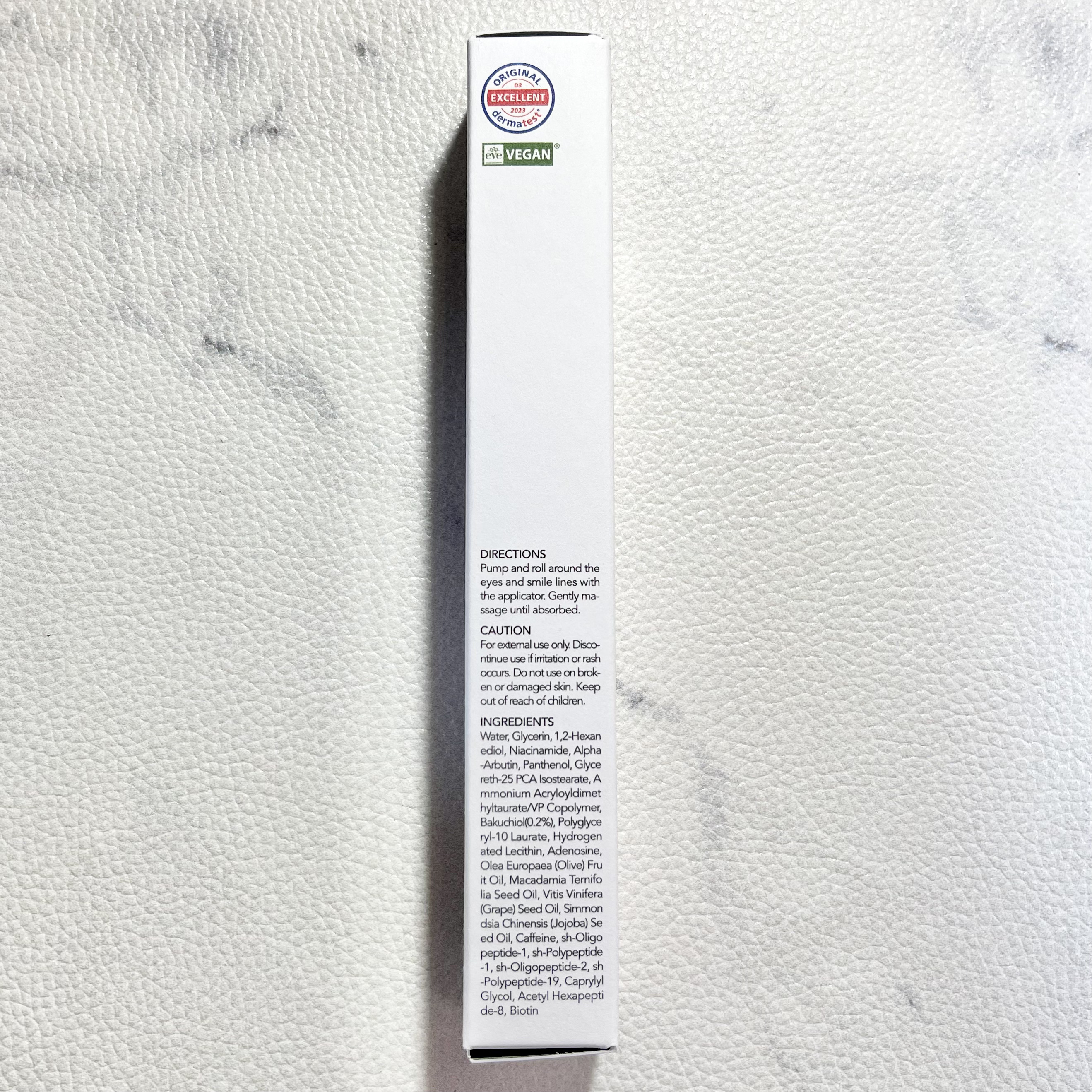 - <15ml > 水、グリセリン、1,2-ヘキサンジオール、ナイアシンアミド、α-アルブチン、ラウリン酸ポリグリセリル-10、水添レシチン、オリーブ果実油、マカデミア種子油、ブドウ種子油、ホホバ種子油、バクチオール、パンテノール、PCAイソステアリン酸グリセレス-25、カフェイン、ビオチン、(アクリロイルジメチルタウリンアンモニウム/VP)コポリマー、カプリリルグリコール、アセチルヘキサペプチド-8、合成ヒト遺伝子組換ポリペプチド-1、合成ヒト遺伝子組換オリゴペプチド-2、合成ヒト遺伝子組換ポリペプチド-19、アデノシン