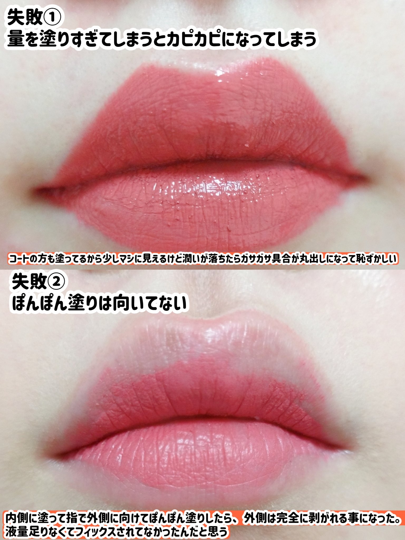 美発色リキッドリップ×バーム状リップコートの2in1。 リキッドリップは発色がよく、単体だとマット、リップコートを塗るとツヤが可愛いです。 発色が良く、落ちにくいリップを探している方におすすめ。