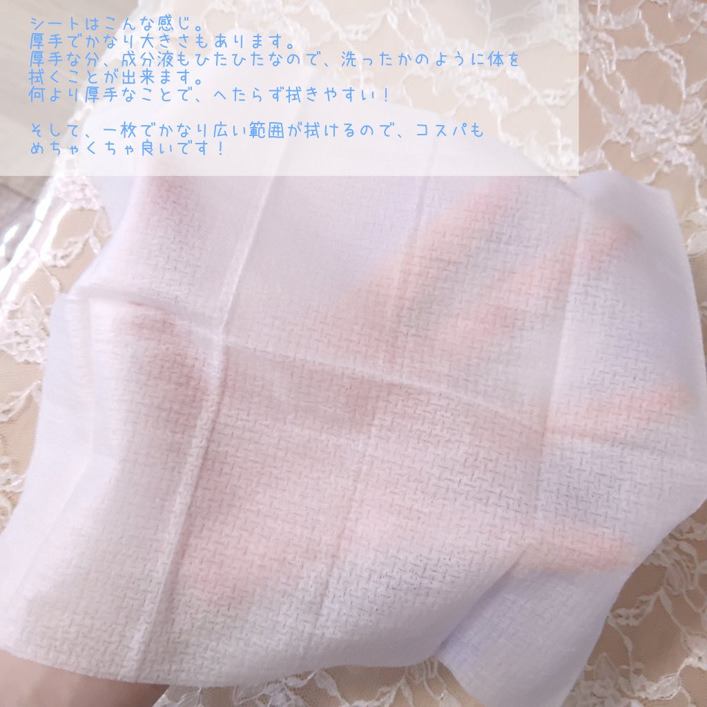 | ボディシートランキング第1位 | 甘いピーチの香りで女性も使いやすいし シートも分厚く1枚で全身しっかり拭けます | 詳細を見る | |