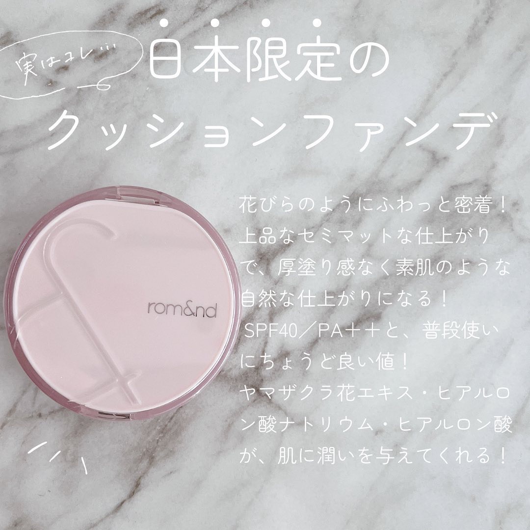 こんばんは🌙今回はrom&ndのブルームインカバーフィットクッション19Cピュアをご紹介します💗💗こちらは、ロムアンドのラッキーバッグに入っていました✨️外箱にひよんちゃんが載っていて、ひよんちゃんオススメの日本人向けに作られたクッションファ...