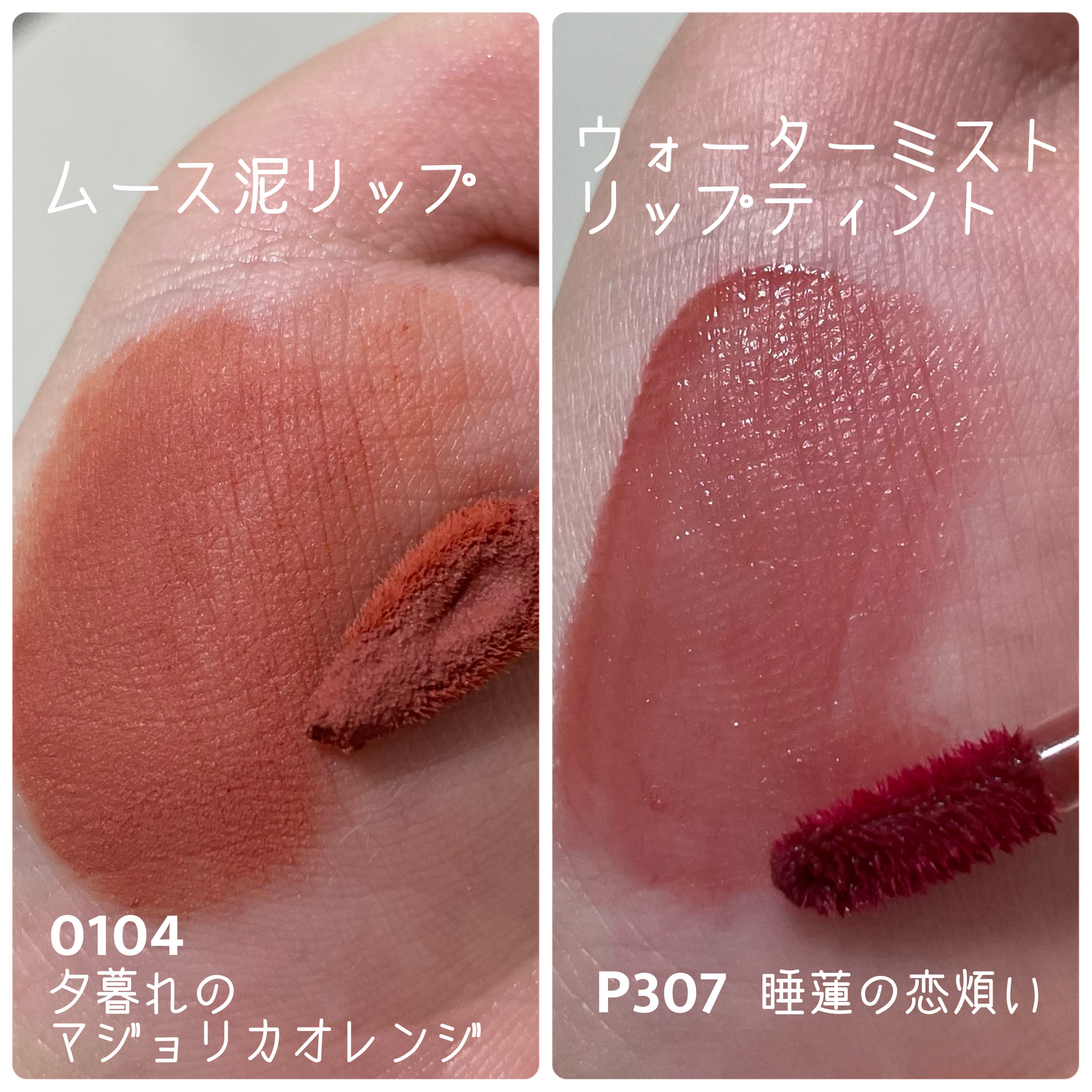 ムース泥リップ は 柔らかくて滑らか、 ムースのように軽くて ふんわりとした塗り心地𓂃 𓈒𓏸 こちらはレッドブラウンの 黄昏のガーネット 608 にしました💋 ウォーターミスト リップティント こちらはくすみピンクの 睡蓮の恋煩い P307 にしました💋 どちらも可愛くて、お手頃♬