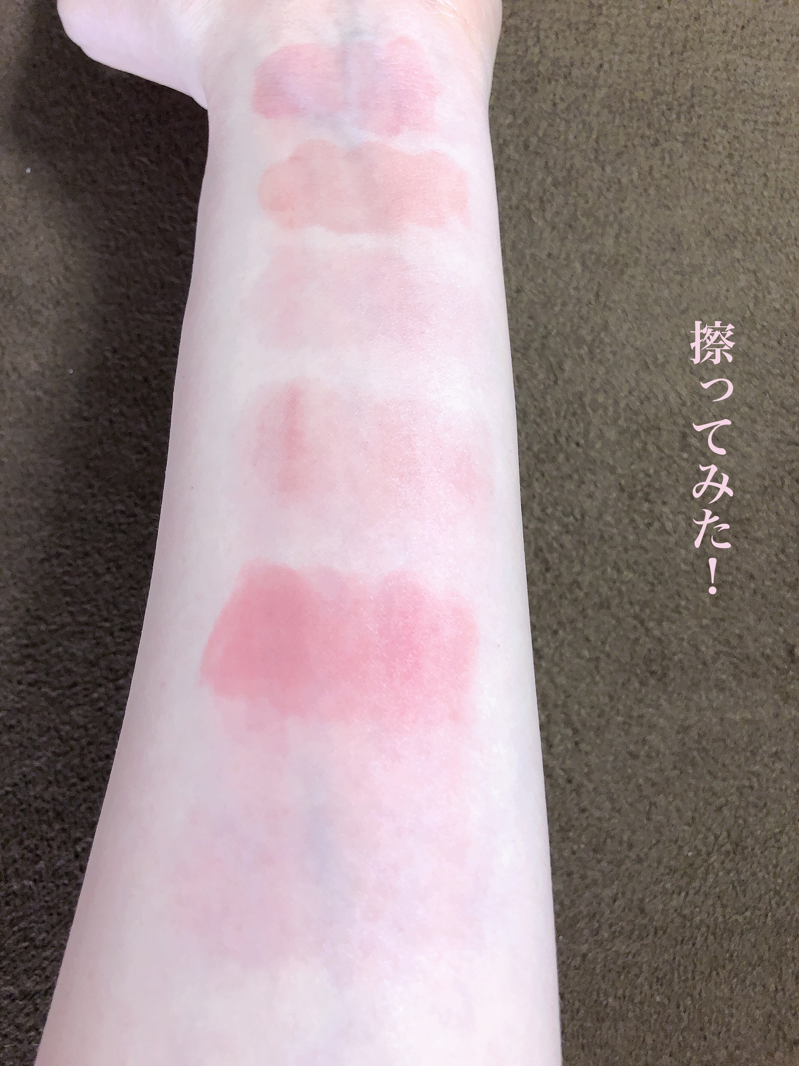 色味が公式と違う感じがしました。公式だとニュートラルなローズピンクという印象でしたが、実際に腕に出してみるとオレンジピンクな色味。 ラメは繊細な輝きで美しく、密着力がありました!ラメだけ単体で発売して欲しいくらい。 私個人としては合わなかったというだけなので、ご参考までに。