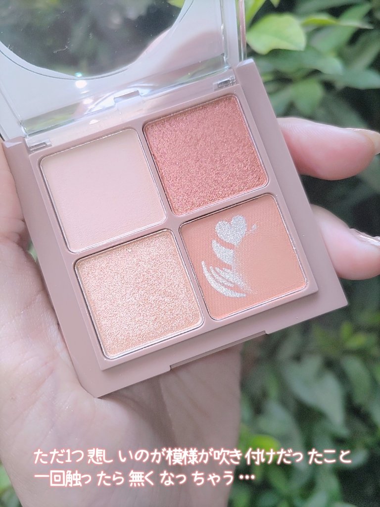 もう見た瞬間ハートの可愛さにめちゃときめいた これはもうベスコスですね! 全体的なバランスも良くてマット、ラメ、パールと一通りそろってます チークも白みのあるオレンジカラーとピーチカラー ハートの部分は白っぽいカラーとピンクっぽいカラー ピンクは結構カラーがでるのでノーズには向かないかな、頬のハイライト兼チークとしてがおすすめ
