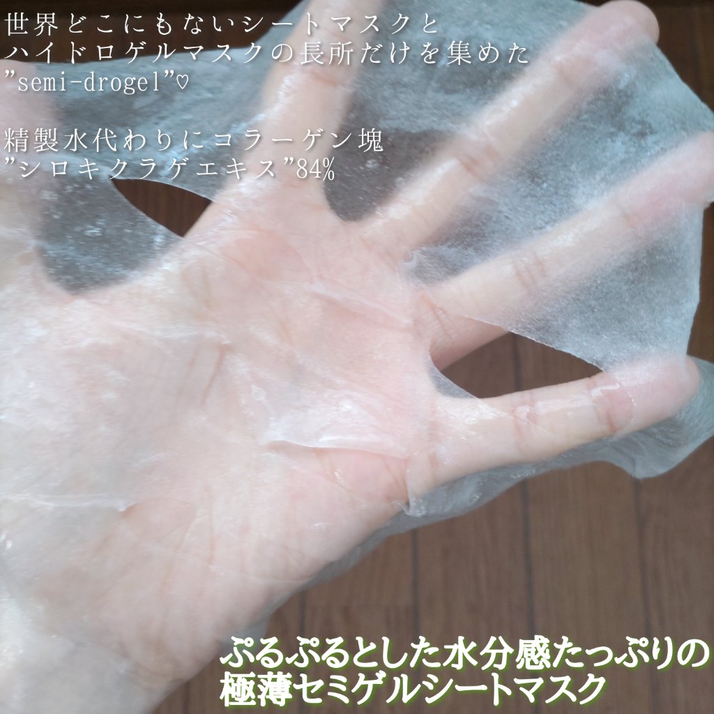 こちらは、世界どこにもないシートマスクとハイドロゲルマスクの長所だけを集めた"semi-drogel" です💎 貼ったようで貼らないような透明なゲルのようにもっちり肌にフィットするマスクで、ぷにぷにと気持ちがいい手触り😌🤍🤍 精製水の代わりにコラーゲン塊"シロキクラゲエキス"が84%配合されているんだって😆✨ 乾かない水分感でシートをはがしたときにしっとり、もちっとした高水分アンプル製剤🩷😉 お肌がツヤんツヤんになった気がします🌟✨✨