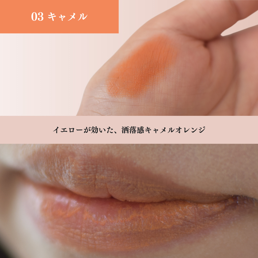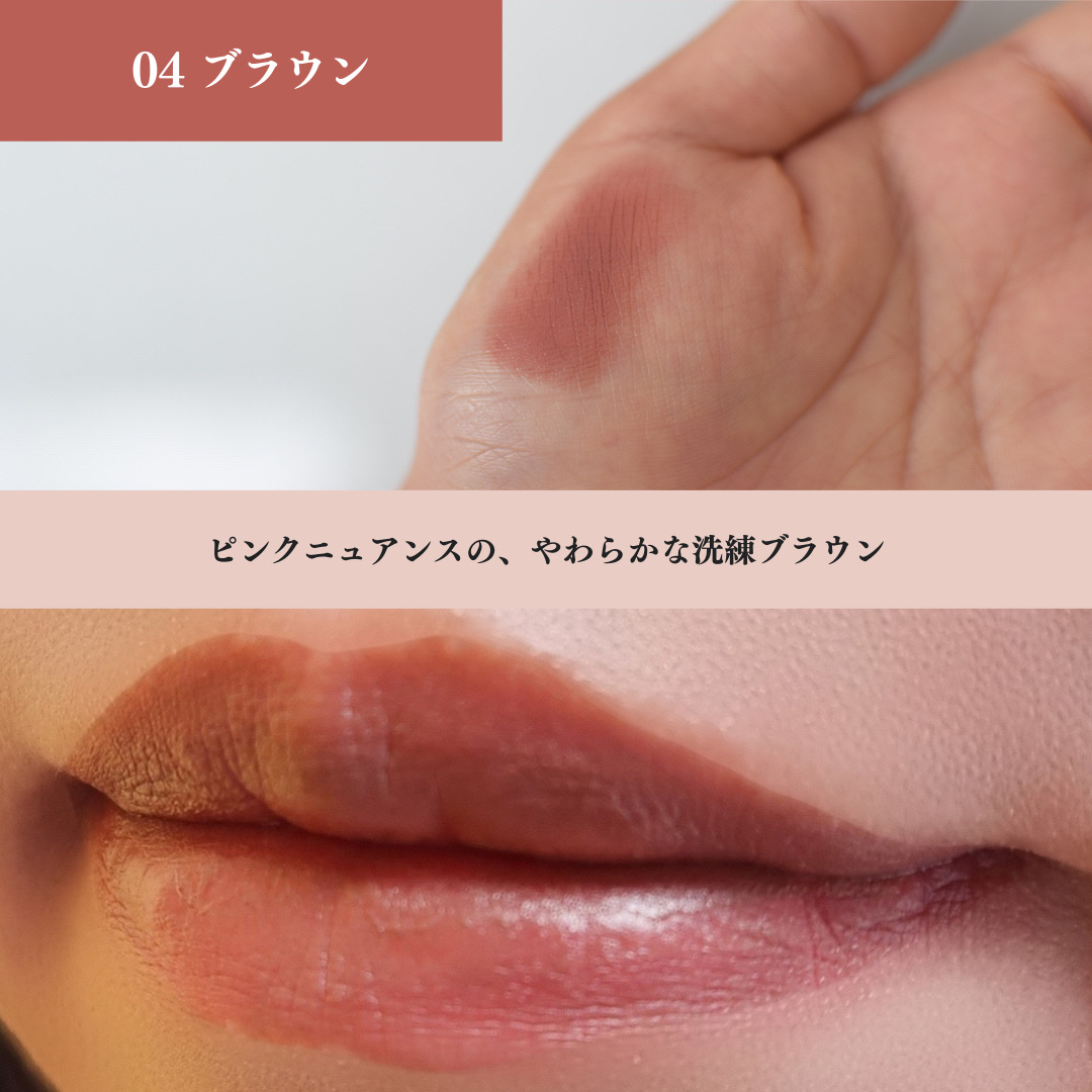 - 密着‘透けマット’ 「保湿」×「色もち」を叶える、パウダーレスマットリップ。 ●独自の保湿膜で、すりガラスのようにふわりと色づく新質感。リップクリーム要らずで手間なく洒落顔に。 ●’美容オイル’を贅沢に配合。しっとり乾燥を防ぎ、唇を守る保湿感。 植物性スクワラン配合(保湿) ●唇にピタッと密着。タテジワをカバーして、ヨレ・はがれも気になりにくく、美しい仕上がりを長時間キープ。 ●無香料・パラベン不使用・動物由来成分不使用