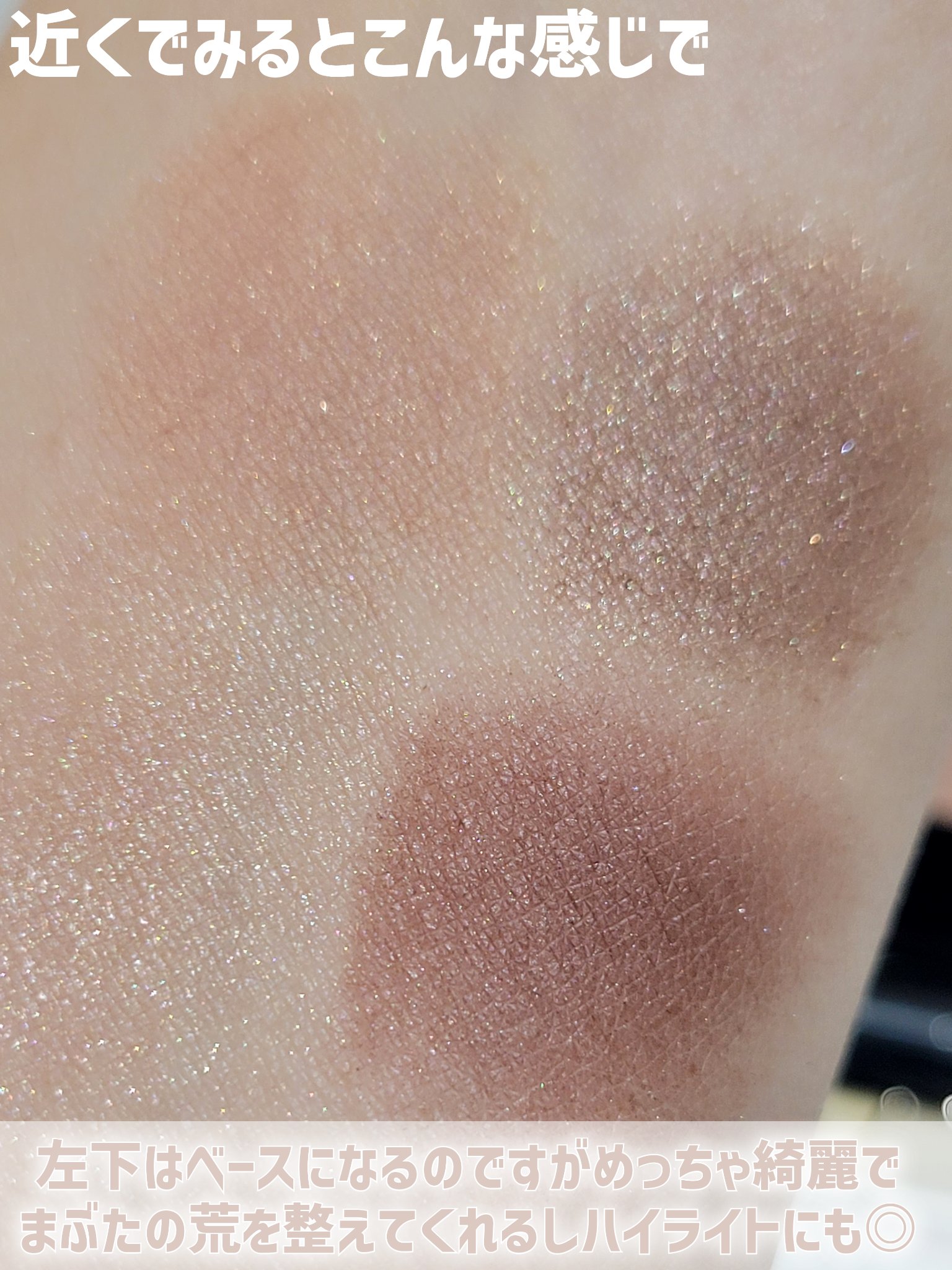 全体のローズ感と粉質もたまらなくいいんですが 左下のハイライトカラー?パールの粉が すんごい涙袋にいいんですよ… パーンとめちゃくちゃ涙袋盛れるけど、 ほんのりピンクがかった白みベージュなので 平成ギャルみたいになるわけではない…と思う ほんとこのハイライトカラーが涙袋に良すぎて いつかここだけ底見えする説…