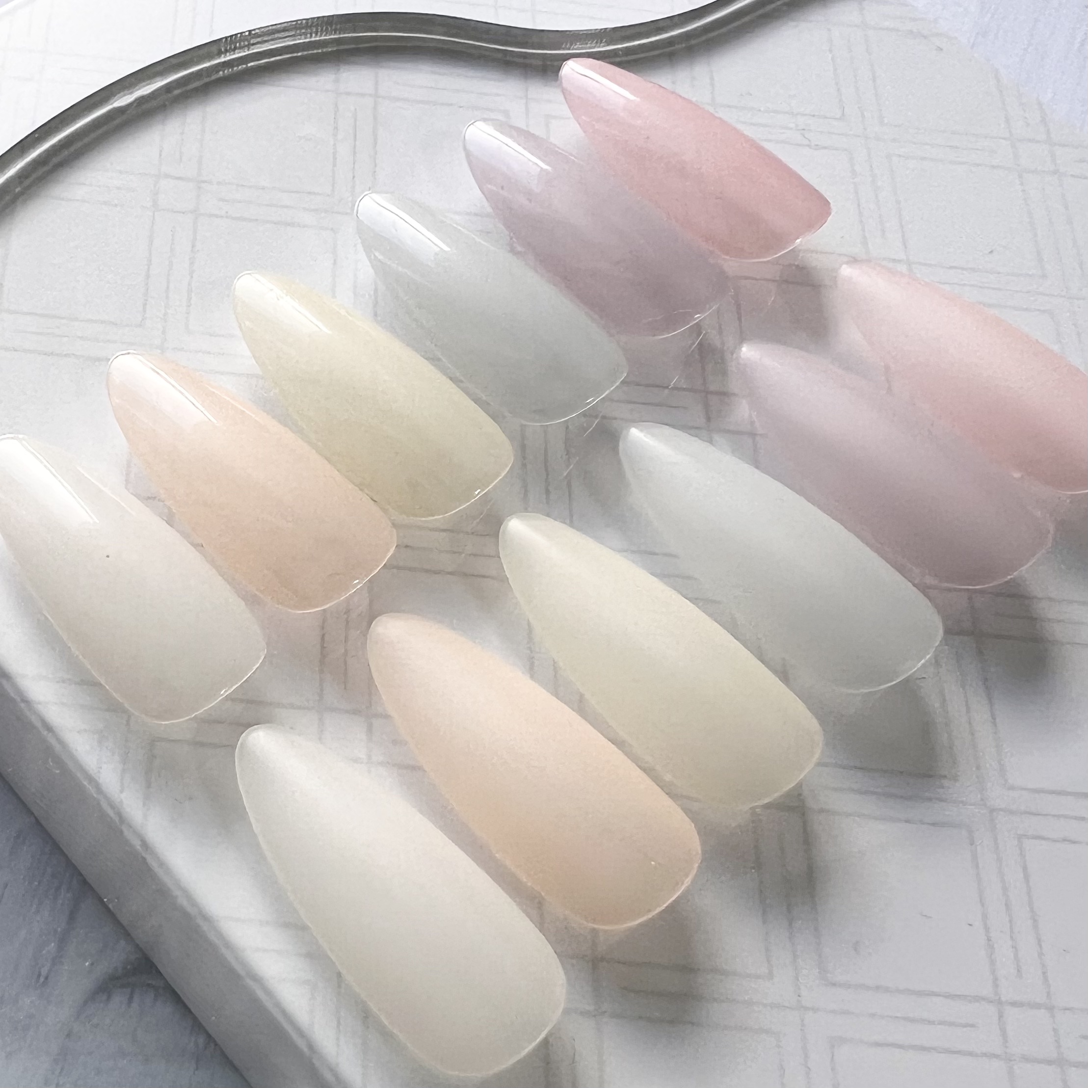 新色は全部で8色です✨ 透け感があって可愛い色♥ すべて2度塗りです。 ミルクホワイト ミルクコーラル シャイニーミルク (ラメ入り) シャイニーコーラル (ラメ入り) ミルクグリーン ミルクブルー アッシュパープル オールドローズ