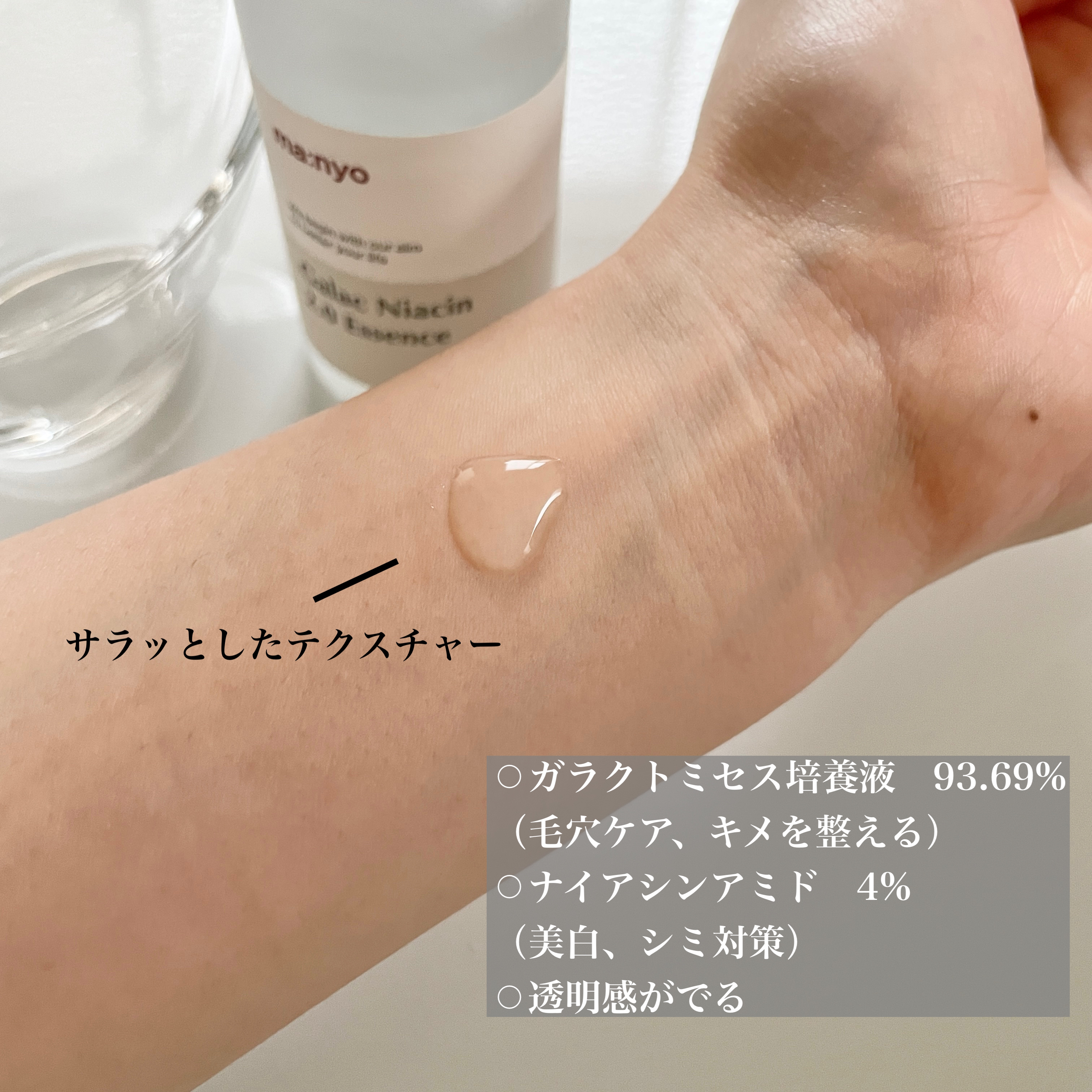- ビタミン、アミノ酸などの有効成分を豊富に含んだガラクトミセスが93%配合され、皮脂・水分バランスの調節、毛穴ケア、トーンアップケアをサポート。ナイアシンアミド4%配合でメラニンの生成を防ぐ濃縮美容液です。水のような軽いテクスチャーでべたつきません。愛用者からは「2週間で肌の変化を実感した」との声が多く届いています。