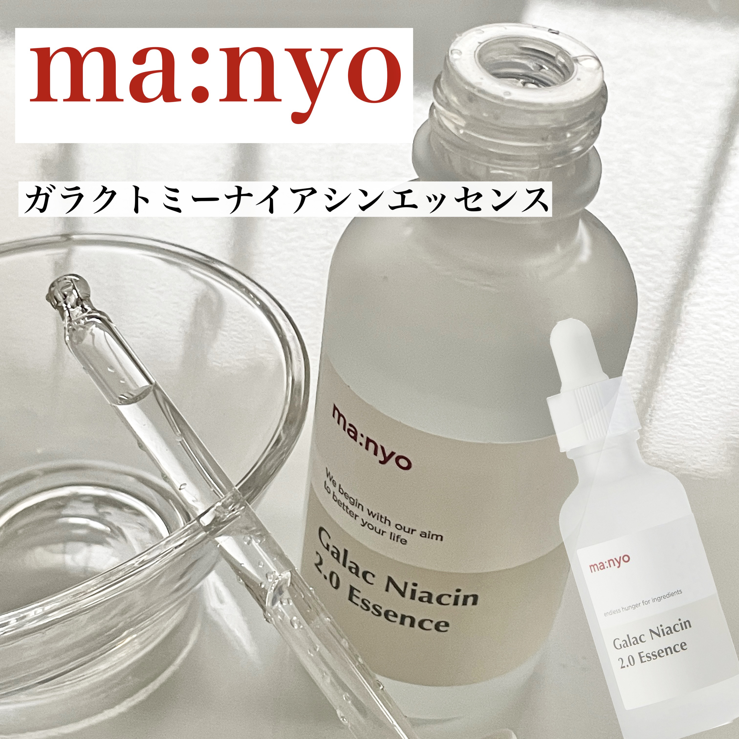 高濃縮ガラクトミセスを配合した美容液🤍 魔女工場の美容液 ガラクナイアシン2.0エッセンスを使ってみました🕊️ manyoは自然由来成分にこだわった肌にやさしい使い心地のスキンケアアイテムを発売するブランド。 低温培養工法(25~26℃)の高濃縮ガラクトミセスを93.69%、保湿成分ナイアシンアミドを4% 配合。