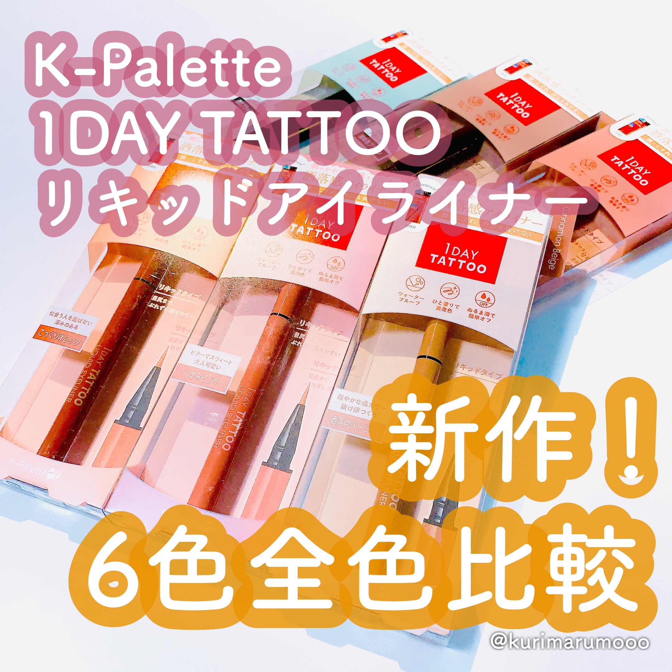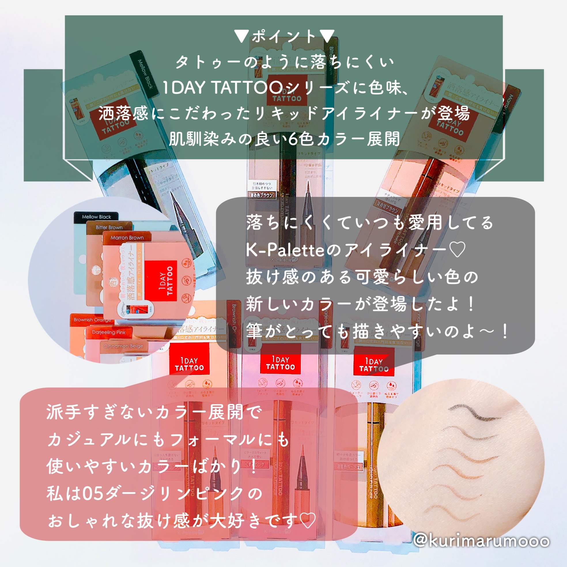 - 『色味』『洒落感』にこだわった新生!『K-パレット 1DAY TATTOO リキッドアイライナー』が登場! 【商品特徴】 1色味の「使いやすさ」と「洒落感」を両立したオリジナルの「スキントーン・カラー」 2メイクや肌トーンに馴染みやすいカラーだから抜け感が生まれ、垢抜け顔に♫ 3「ハイブリッドTATTOO FILM」で朝のキレイを崩さない 4オリジナル「ブレンド筆」で感動の描き心地 5 7種の美容保湿成分配合 6ぬるま湯で簡単オフ! 7色素沈着しにくい! 8速乾・にじみにくい