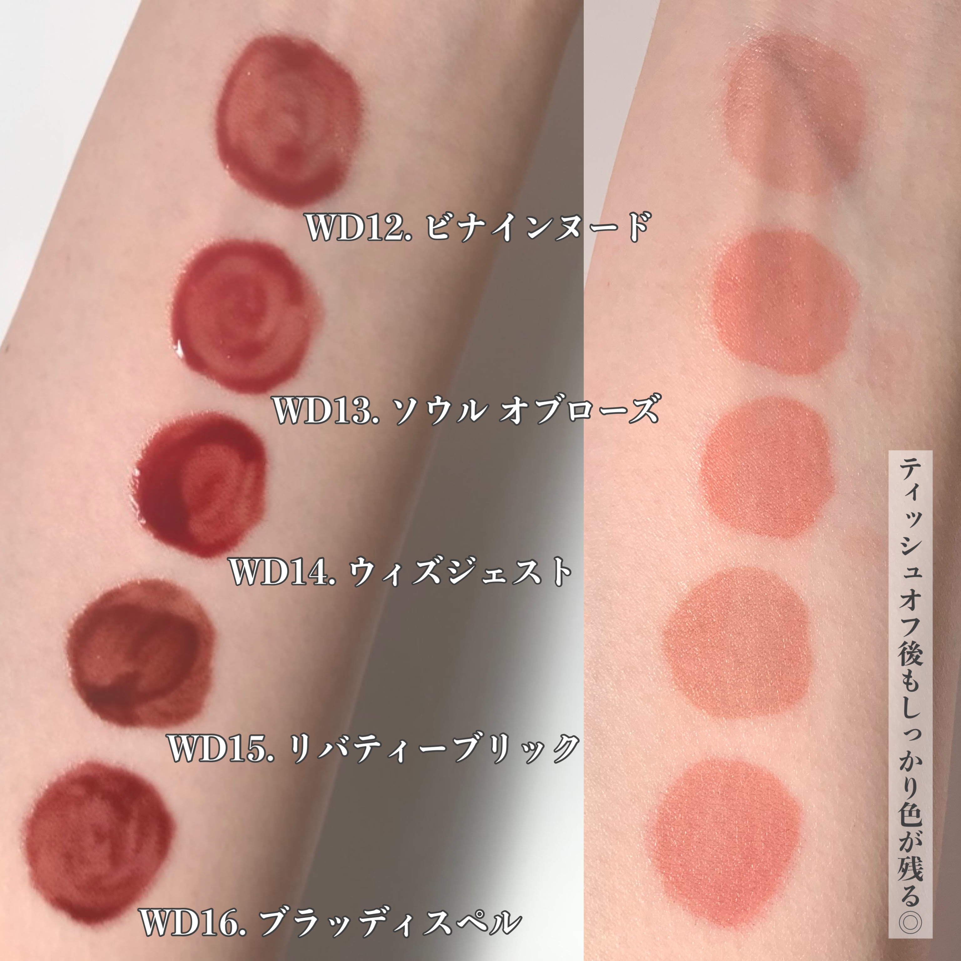 - <WD2 ビトゥン ローズ> 水、ジフェニルジメチコン、リンゴ酸ジイソステアリル、ビスジグリセリルポリアシルアジペート-2、水添ポリイソブテン、ジグリセリン、DPG、セチルPEG/PPG-10/1ジメチコン、イソステアリン酸ソルビタン、ポリソルベート60、ペンチレングリコール、オクチルドデカノール、セテアレス-20、(アクリル酸ヒドロキシエチル/アクリロイルジメチルタウリンNa)コポリマー、スクワラン、フェノキシエタノール、ポリグリセリン-3、ステビオシド、香料、エチルヘキシルグリセリン、グリセリン、シア脂、ツバキ種子油、トリ(カプリル酸/カプリン酸)グリセリル、アルガニアスピノサ核油、ホホバ種子油、アーモンド油、アンズ核油、月見草油、オリーブ果実油、テトラ(ジ-t-ブチルヒドロキシヒドロケイヒ酸)ペンタエリスリチル、カニナバラ果実エキス、マンゴー果実エキス、赤104(1)、赤227、黄5、青1 <WD3 ピンク ヘイズ> 水、ジフェニルジメチコン、リンゴ酸ジイソステアリル、ビスジグリセリルポリアシルアジペート-2、水添ポリイソブテン、ジグリセリン、DPG、セチルPEG/PPG-10/1ジメチコン、イソステアリン酸ソルビタン、ポリソルベート60、ペンチレングリコール、オクチルドデカノール、セテアレス-20、(アクリル酸ヒドロキシエチル/アクリロイルジメチルタウリンNa)コポリマー、スクワラン、フェノキシエタノール、ポリグリセリン-3、ステビオシド、香料、エチルヘキシルグリセリン、グリセリン、水酸化Al、ポリアクリル酸アンモニウム、BG、アルガニアスピノサ核油、シア脂、ツバキ種子油、トリ(カプリル酸/カプリン酸)グリセリル、アーモンド油、アンズ核油、ホホバ種子油、月見草油、オリーブ果実油、テトラ(ジ-t-ブチルヒドロキシヒドロケイヒ酸)ペンタエリスリチル、マンゴー果実エキス、カニナバラ果実エキス、酸化チタン、赤104(1)、赤227、黄5、青1 <WD4 オールウェイズ ヤング> 水、ジフェニルジメチコン、リンゴ酸ジイソステアリル、ビスジグリセリルポリアシルアジペート-2、水添ポリイソブテン、ジグリセリン、DPG、セチルPEG/PPG-10/1ジメチコン、イソステアリン酸ソルビタン、ポリソルベート60、ペンチレングリコール、オクチルドデカノール、セテアレス-20、(アクリル酸ヒドロキシエチル/アクリロイルジメチルタウリンNa)コポリマー、スクワラン、フェノキシエタノール、ポリグリセリン-3、ステビオシド、香料、エチルヘキシルグリセリン、グリセリン、シア脂、ツバキ種子油、トリ(カプリル酸/カプリン酸)グリセリル、アルガニアスピノサ核油、ホホバ種子油、アーモンド油、アンズ核油、月見草油、オリーブ果実油、テトラ(ジ-t-ブチルヒドロキシヒドロケイヒ酸)ペンタエリスリチル、カニナバラ果実エキス、マンゴー果実エキス、赤104(1)、赤227、黄5、青1 <WD6 クラッシュド パンプキン> 水、水添ポリイソブテン、リンゴ酸ジイソステアリル、ビスジグリセリルポリアシルアジペート-2、ジフェニルシロキシフェニルトリメチコン、ジフェニルジメチコン、ポリグリセリン-3、オクチルドデカノール、ポリソルベート60、セチルPEG/PPG-10/1ジメチコン、ラウリン酸ポリグリセリル-10、ペンチレングリコール、1,2-ヘキサンジオール、(アクリル酸ヒドロキシエチル/アクリロイルジメチルタウリンNa)コポリマー、PEG-60水添ヒマシ油、セテアリルアルコール、スクワラン、キシリトール、エチルヘキシルグリセリン、香料、ポリアクリル酸アンモニウム、イソステアリン酸ソルビタン、水酸化Al、フェノキシエタノール、BG、トコフェロール、酸化チタン、酸化鉄、赤227、黄4、黄5、青1 <WD8 ビンテージ カラント> 水、水添ポリイソブテン、リンゴ酸ジイソステアリル、ビスジグリセリルポリアシルアジペート-2、ジフェニルシロキシフェニルトリメチコン、ジフェニルジメチコン、オクチルドデカノール、ポリグリセリン-3、ポリソルベート60、セチルPEG/PPG-10/1ジメチコン、ラウリン酸ポリグリセリル-10、1,2-ヘキサンジオール、ペンチレングリコール、(アクリル酸ヒドロキシエチル/アクリロイルジメチルタウリンNa)コポリマー、PEG-60水添ヒマシ油、セテアリルアルコール、スクワラン、キシリトール、エチルヘキシルグリセリン、香料、イソステアリン酸ソルビタン、トコフェロール、赤104(1)、赤227、黄5、青1 <WD9 ミスター ストレンジャー> 水、水添ポリイソブテン、リンゴ酸ジイソステアリル、ビスジグリセリルポリアシルアジペート-2、ジフェニルシロキシフェニルトリメチコン、ジフェニルジメチコン、オクチルドデカノール、ポリグリセリン-3、ポリソルベート60、セチルPEG/PPG-10/1ジメチコン、ラウリン酸ポリグリセリル-10、1,2-ヘキサンジオール、ペンチレングリコール、(アクリル酸ヒドロキシエチル/アクリロイルジメチルタウリンNa)コポリマー、セテアリルアルコール、PEG-60水添ヒマシ油、スクワラン、キシリトール、エチルヘキシルグリセリン、香料、イソステアリン酸ソルビタン、水酸化Al、ポ