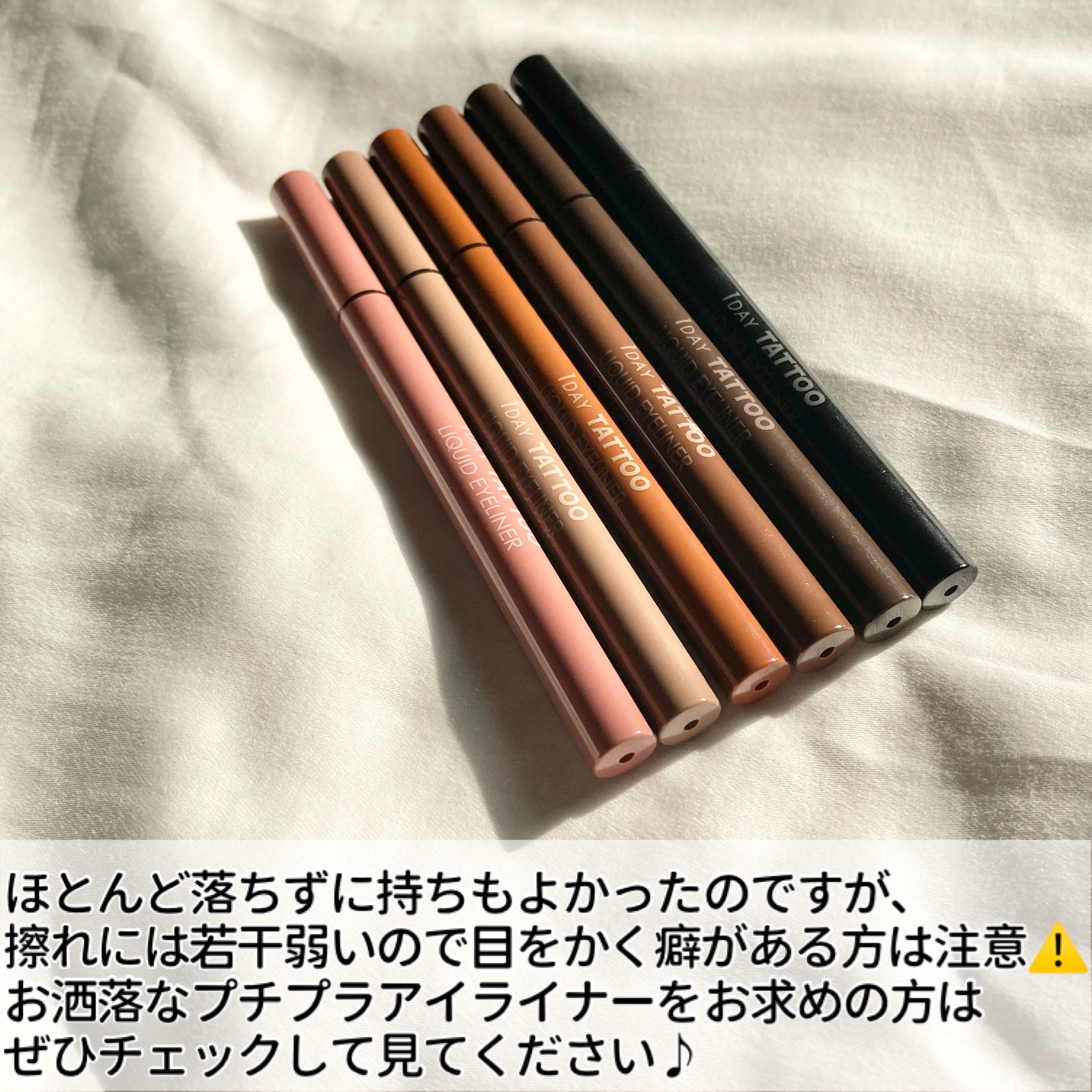 - 『色味』『洒落感』にこだわった新生!『K-パレット 1DAY TATTOO リキッドアイライナー』が登場! 【商品特徴】 1色味の「使いやすさ」と「洒落感」を両立したオリジナルの「スキントーン・カラー」 2メイクや肌トーンに馴染みやすいカラーだから抜け感が生まれ、垢抜け顔に♫ 3「ハイブリッドTATTOO FILM」で朝のキレイを崩さない 4オリジナル「ブレンド筆」で感動の描き心地 5 7種の美容保湿成分配合 6ぬるま湯で簡単オフ! 7色素沈着しにくい! 8速乾・にじみにくい