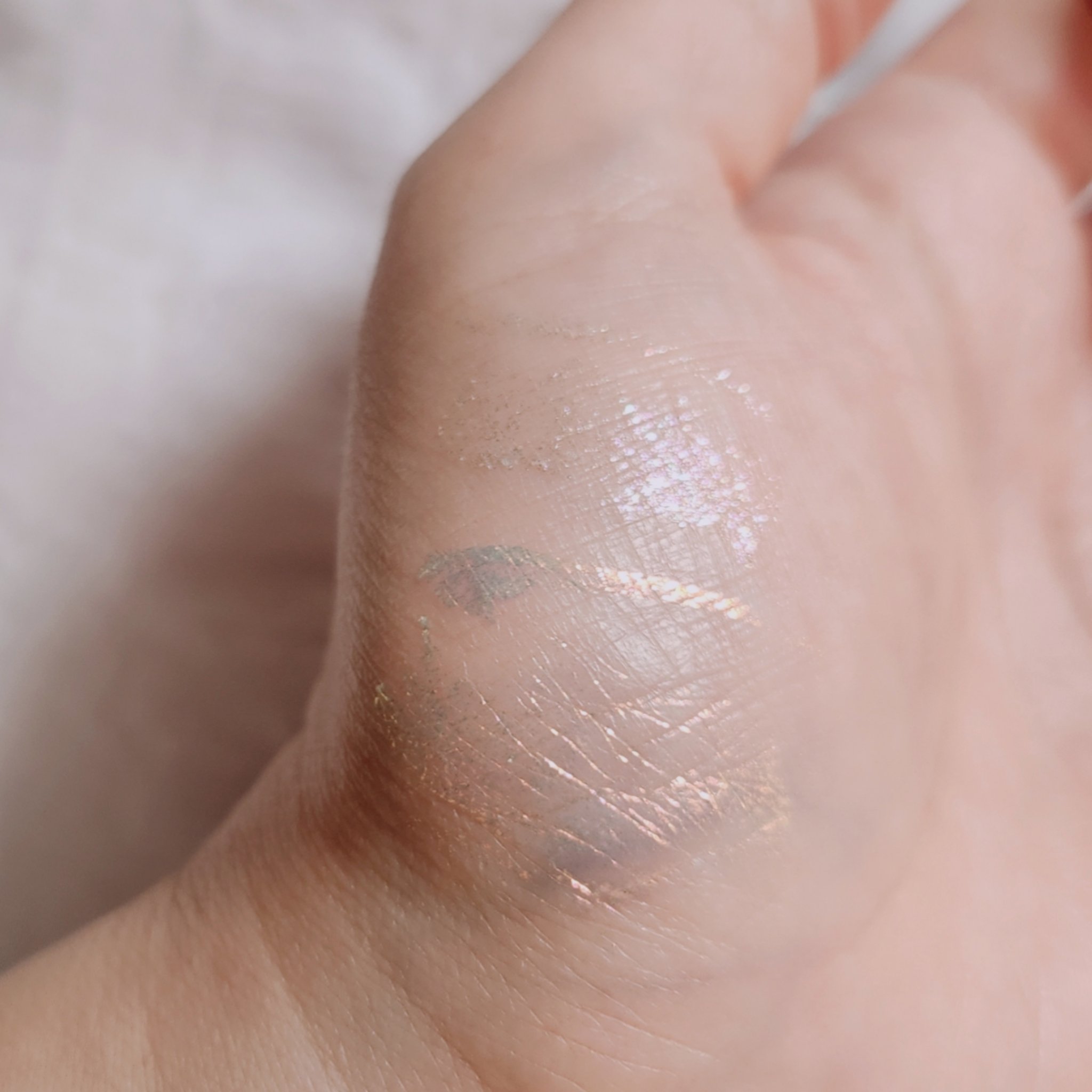 ベージュでこんな可愛くなれるんだと感動したラメ感と発色 肌に溶け込む分、どんな風に塗っても失敗しないし、自然に掘りが深い感じの目元になれる👍 ガラスパールのラメとほんのりコーラルがかったベージュで馴染みすぎず、抜け感のある雰囲気も出せて絶妙なオシャレ発色✨ ハイライトが偏光と記載があり、かなり発光します💡✨ 繊細なパールで目の下辺りとかは少し毛穴が目立つ感じもあり、マットのフェイスパウダーで調節しつつ使うとちょうど良くなりました🥰 とにかく粉がしっとりなめらかで、色の調節がしやすい❣️ 1色1色の面積もまぁまぁ大きいのでチークブラシでも取りやすく、顔全体に使えて便利🙆 日常使いしたいパレットです💕