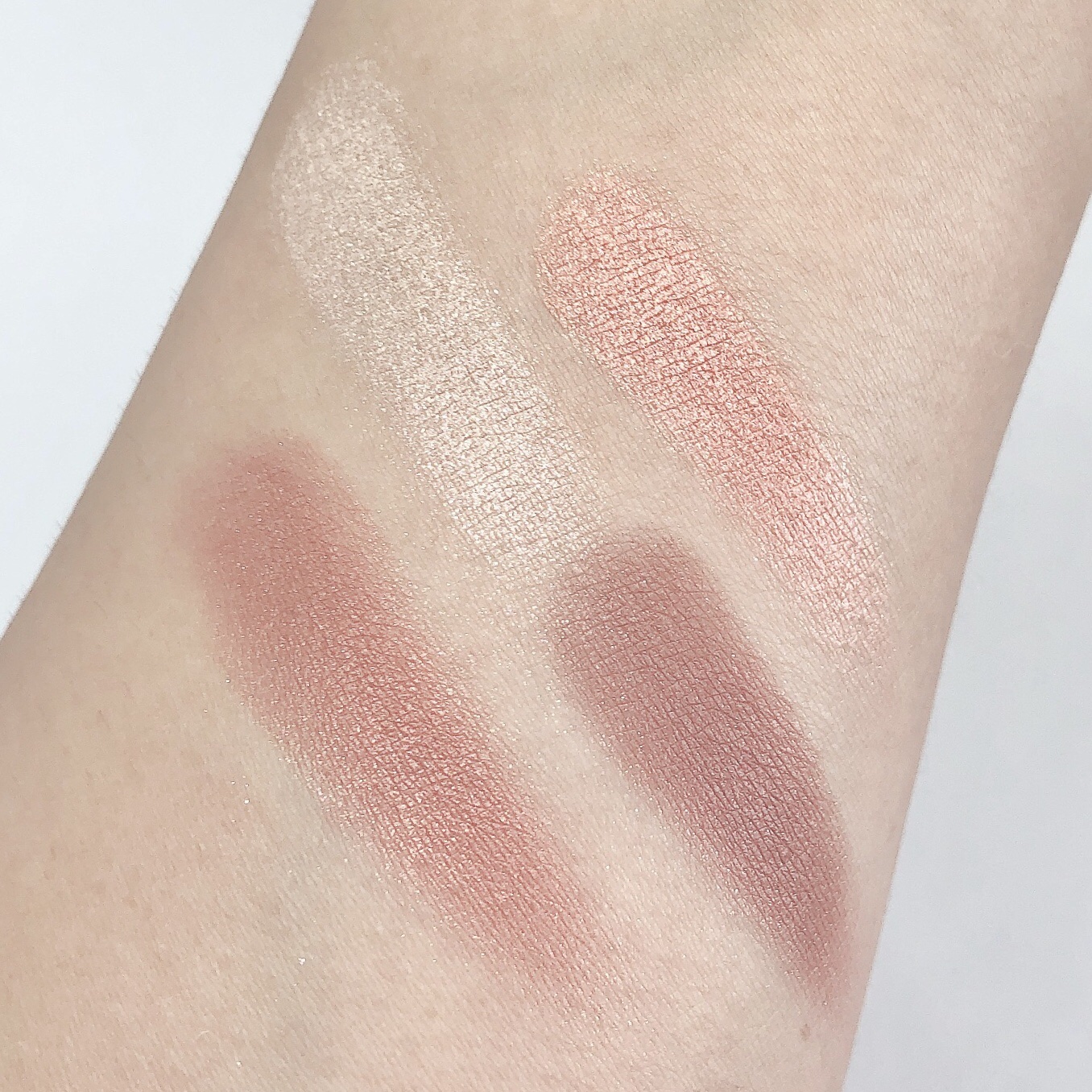 全体的には、名前のとおりヌーディーな印象☺️定番色「01 本命のブラウン」と似てるんだけど、今回の「104 本能のヌードベージュ」の方が、よりヌーディーなカラーとなっておりまする💁🏻♀️ 左上のベージュカラー(1番)は、基本的にはマットカラーなんだけど、ほんのりラメも入ってるから、のっぺりとした印象にならなくて良き🥰 4番のカラーは、ハイライトとして使うこともできるし、個人的には涙袋に使っても良いのではないかと思っておりまする👻 こちらは、全体的にしっとりとしたテクスチャーとなっておりまする💖そして、上2色のマットカラーが、結構しっかり発色してくれます❣️ 右下のハイライトカラーも、「104 本能のヌードベージュ」ほど白っぽくならないので、さりげなくハイライトを入れたい人にピッタリ✨