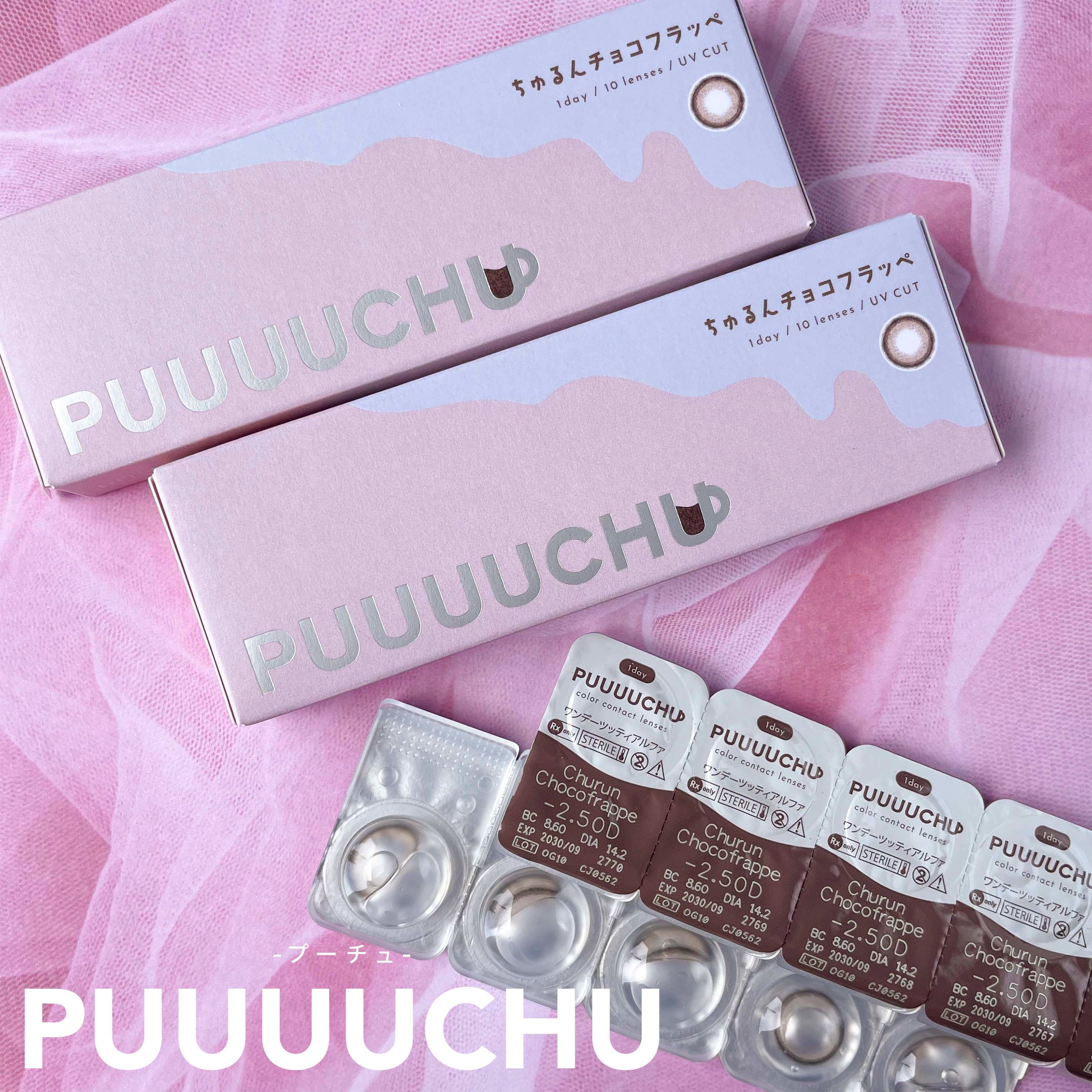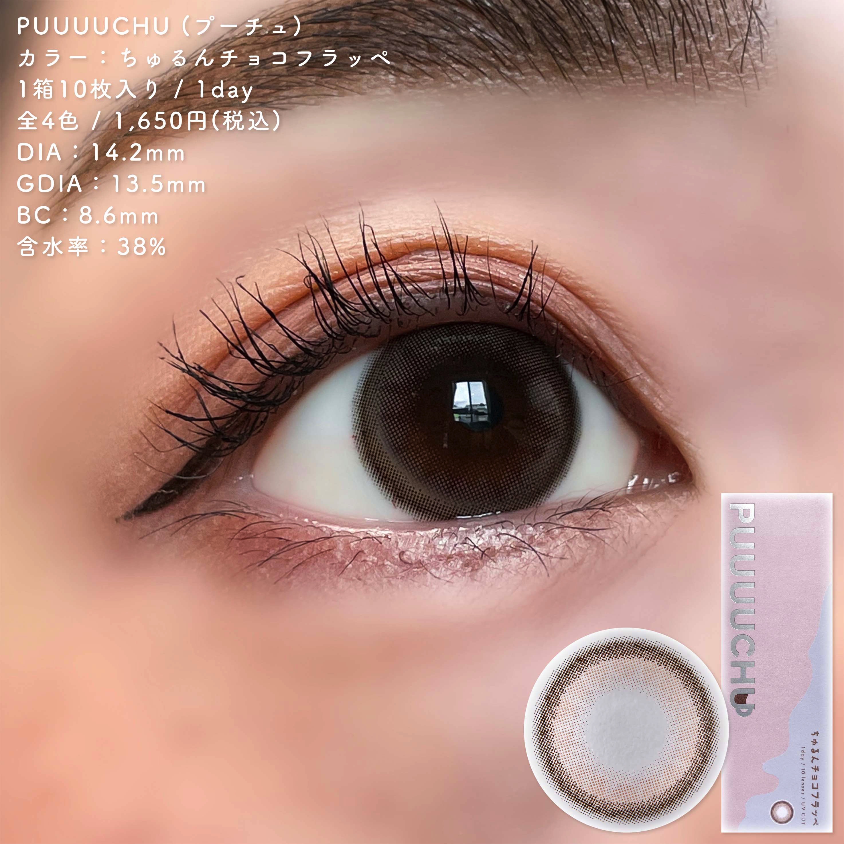 - ※2023年7月よりパッケージ底面カラー名表記部分、順次リニューアル。尚、これに係る商品の返品・交換等は承っておりません。 女の子の「かわいい」がぜーんぶ叶うよくばりなラインナップ 絶対ばぶフェイス♡ちゅるんチョコフラッペ DIA14.2mm/着色直径13.5mm 細フチ×ピュアベージュ ピュアちゅるんレンズで守りたくなっちゃうような甘めの瞳に 王道人類モテ♡ふわふわカプチーノ DIA14.5mm/着色直径13.7mm ぽんわりフチ×ふわブラウン フチふんわりシフォンブラウンレンズで優し気な瞳に 超絶盛れ地雷女子♡きゅるきゅるダークモカ DIA14.5mm/着色直径13.8mm 溶け込みグラデ×きゅるんブラック くっきり暗めカラーレンズでお人形さんみたいにくっきりとした印象の瞳に 韓国系クール美人♡ぷるるんソーダフロート DIA14.2mm/着色直径13.2mm うるうる質感×透明感ブルー うるうる透明感ブルーグレーレンズでクールビューティーな瞳に 商品名 :PUUUUCHU(プーチュ) 価格 :1,650円 税込(10枚入り) カラー :全4色 レンズ :BC8.6mm DIA14.2mm/14.5mm UVカット 含水率 :38% 使用期間 :終日装用、一日交換 度数 :0.00D(度なし),-0.50D~-6.00D(0.25D刻み),-6.50D~-10.00D(0.50D刻み) 販売名 :ワンデーツッティアルファ 承認番号 :22400BZX00427000 カラーコンタクトレンズの不適正使用による眼障害の危険性等などがあります。 ●コンタクトレンズは高度管理医療機器です。不十分な洗浄・消毒など不適切なケアや、長時間・交換期間を超えた装用により、アレルギー性結膜炎、角膜感染症、角膜潰瘍等の重篤な眼障害が発生する危険性があります ●ご使用前に取扱説明書を確認してください 使用上の留意事項 ●眼科医院等を受診してからお求めください ●眼に異常を感じたら直ちにレンズ使用を中止し、お近くの眼科等で診察を受けてください ●医師の指示にしたがってご使用ください ●コンタクトレンズを装用する場合、自覚症状がなくても、眼科医院等での定期検査を受けてください ●レンズに不具合がある場合は使用しないでください