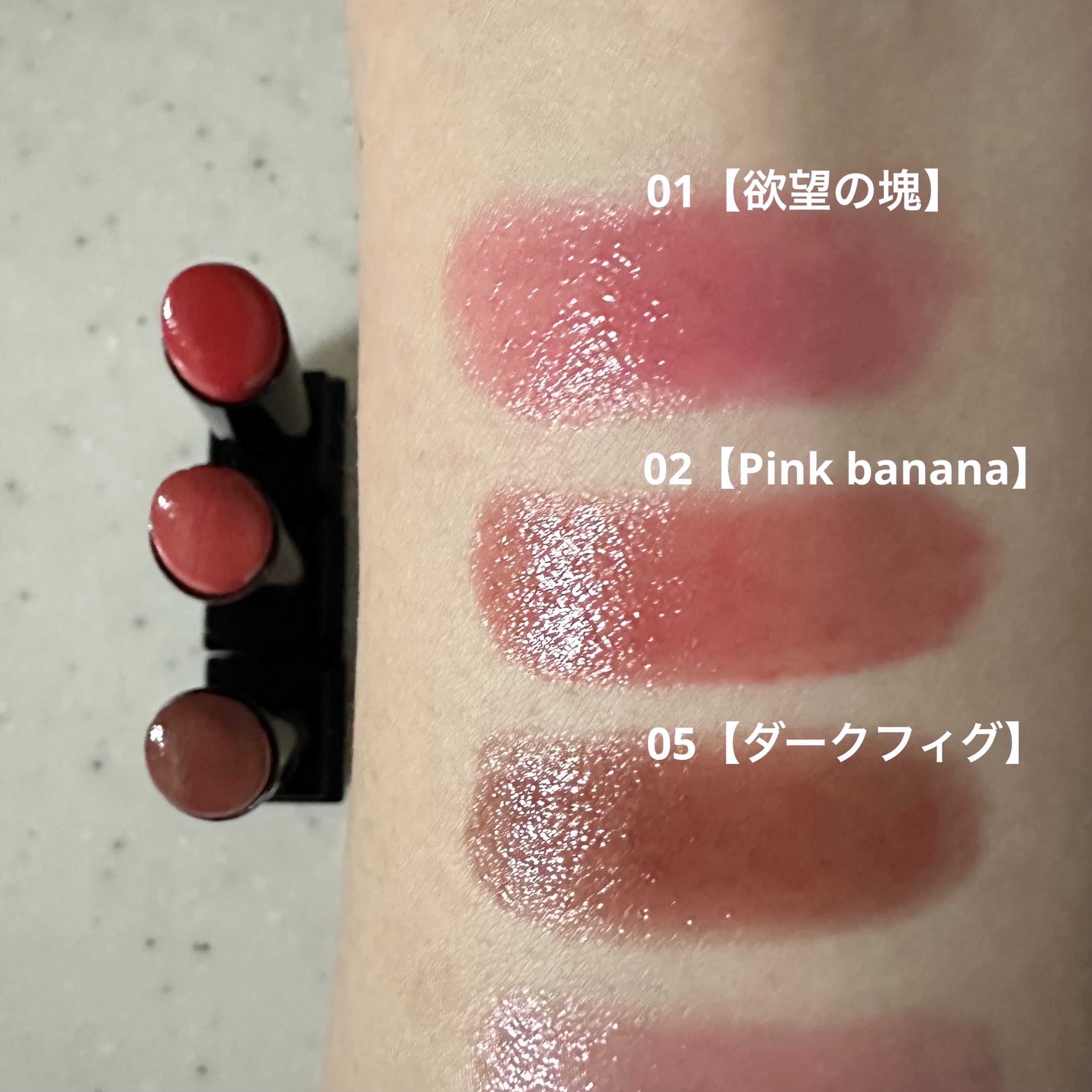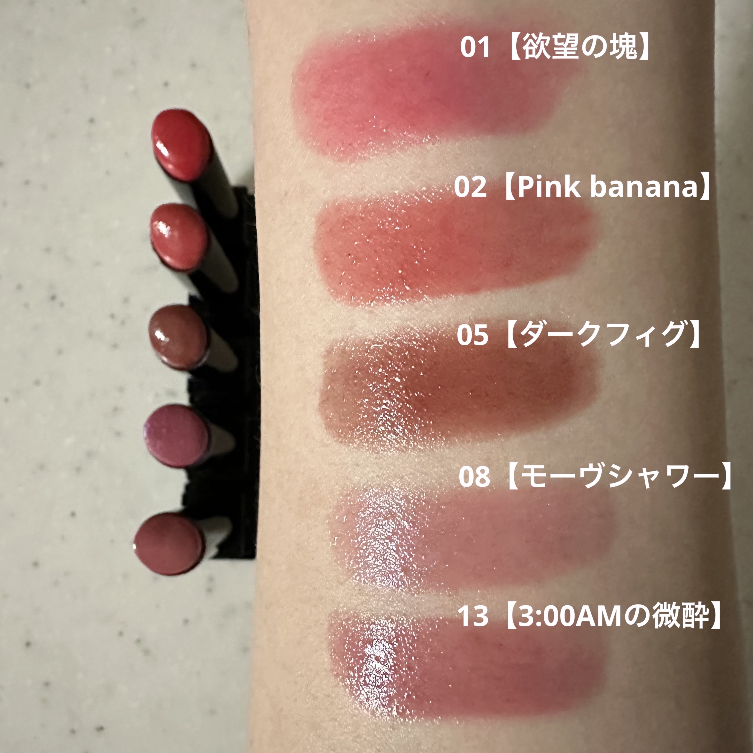- <01 欲望の塊> テトライソステアリン酸ジペンタエリスリチル、トリ(カプリル酸/カプリン酸)グリセリル、オクチルドデカノール、ラウロイルグルタミン酸ジ(フィトステリル/オクチルドデシル)、ビスアルキル(C16-18)グリセリルウンデシルジメチコン、イソノナン酸イソトリデシル、水添ポリイソブテン、ラウロイルグルタミン酸ジ(オクチルドデシル/フィトステリル/ベヘニル)、パラフィン、合成ワックス、ダイマージリノール酸(フィトステリル/イソステアリル/セチル/ステアリル/ベヘニル)、マイクロクリスタリンワックス、水添マイクロクリスタリンワックス、ヒドロキシステアリン酸エチルヘキシル、トコフェロール、ホホバ種子油、オリーブ果実油、アーモンド油、(エチレン/プロピレン)コポリマー、ポリエチレン、ジメチコン、(+/-)(チタン/酸化チタン)焼結物、マイカ、ラウロイルアスパラギン酸Na、ラウロイルリシン、塩化亜鉛、酸化チタン、酸化鉄、水酸化Al、硫酸Ba、トリイソステアリン酸イソプロピルチタン、酸化スズ、ホウケイ酸(Ca/Al)、合成フルオロフロゴパイト、黄4、黄5、赤104(1)、赤201、赤202 <02 ピンクバナナ> テトライソステアリン酸ジペンタエリスリチル、トリ(カプリル酸/カプリン酸)グリセリル、オクチルドデカノール、ラウロイルグルタミン酸ジ(フィトステリル/オクチルドデシル)、ビスアルキル(C16-18)グリセリルウンデシルジメチコン、イソノナン酸イソトリデシル、水添ポリイソブテン、ラウロイルグルタミン酸ジ(オクチルドデシル/フィトステリル/ベヘニル)、パラフィン、合成ワックス、ダイマージリノール酸(フィトステリル/イソステアリル/セチル/ステアリル/ベヘニル)、マイクロクリスタリンワックス、水添マイクロクリスタリンワックス、ヒドロキシステアリン酸エチルヘキシル、トコフェロール、ホホバ種子油、オリーブ果実油、アーモンド油、(エチレン/プロピレン)コポリマー、ポリエチレン、ジメチコン、(+/-)(チタン/酸化チタン)焼結物、マイカ、ラウロイルアスパラギン酸Na、ラウロイルリシン、塩化亜鉛、酸化チタン、酸化鉄、水酸化Al、硫酸Ba、トリイソステアリン酸イソプロピルチタン、酸化スズ、ホウケイ酸(Ca/Al)、合成フルオロフロゴパイト、黄4、黄5、赤104(1)、赤201、赤202 <03 陽炎> テトライソステアリン酸ジペンタエリスリチル、トリ(カプリル酸/カプリン酸)グリセリル、オクチルドデカノール、ラウロイルグルタミン酸ジ(フィトステリル/オクチルドデシル)、ビスアルキル(C16-18)グリセリルウンデシルジメチコン、イソノナン酸イソトリデシル、水添ポリイソブテン、ラウロイルグルタミン酸ジ(オクチルドデシル/フィトステリル/ベヘニル)、パラフィン、合成ワックス、ダイマージリノール酸(フィトステリル/イソステアリル/セチル/ステアリル/ベヘニル)、マイクロクリスタリンワックス、水添マイクロクリスタリンワックス、ヒドロキシステアリン酸エチルヘキシル、トコフェロール、ホホバ種子油、オリーブ果実油、アーモンド油、(エチレン/プロピレン)コポリマー、ポリエチレン、ジメチコン、(+/-)(チタン/酸化チタン)焼結物、マイカ、ラウロイルアスパラギン酸Na、ラウロイルリシン、塩化亜鉛、酸化チタン、酸化鉄、水酸化Al、硫酸Ba、トリイソステアリン酸イソプロピルチタン、酸化スズ、ホウケイ酸(Ca/Al)、合成フルオロフロゴパイト、黄4、黄5、赤104(1)、赤201、赤202 <04 パンプキンワイン> テトライソステアリン酸ジペンタエリスリチル、トリ(カプリル酸/カプリン酸)グリセリル、オクチルドデカノール、ラウロイルグルタミン酸ジ(フィトステリル/オクチルドデシル)、ビスアルキル(C16-18)グリセリルウンデシルジメチコン、イソノナン酸イソトリデシル、水添ポリイソブテン、ラウロイルグルタミン酸ジ(オクチルドデシル/フィトステリル/ベヘニル)、パラフィン、合成ワックス、ダイマージリノール酸(フィトステリル/イソステアリル/セチル/ステアリル/ベヘニル)、マイクロクリスタリンワックス、水添マイクロクリスタリンワックス、ヒドロキシステアリン酸エチルヘキシル、トコフェロール、ホホバ種子油、オリーブ果実油、アーモンド油、(エチレン/プロピレン)コポリマー、ポリエチレン、ジメチコン、(+/-)(チタン/酸化チタン)焼結物、マイカ、ラウロイルアスパラギン酸Na、ラウロイルリシン、塩化亜鉛、酸化チタン、酸化鉄、水酸化Al、硫酸Ba、トリイソステアリン酸イソプロピルチタン、酸化スズ、ホウケイ酸(Ca/Al)、合成フルオロフロゴパイト、黄4、黄5、赤104(1)、赤201、赤202 <05 ダークフィグ> テトライソステアリン酸ジペンタエリスリチル、トリ(カプリル酸/カプリン酸)グリセリル、オクチルドデカノール、ラウロイルグルタミン酸ジ(フィトステリル/オクチルドデシル)、ビスアルキル(C16-18)グリセリルウンデシルジメチコン、イソノナン酸イソトリデシル、水添ポリイソブテン、ラウロイルグルタミン酸ジ(オクチルドデシル/フィトステリル/ベヘニル)、