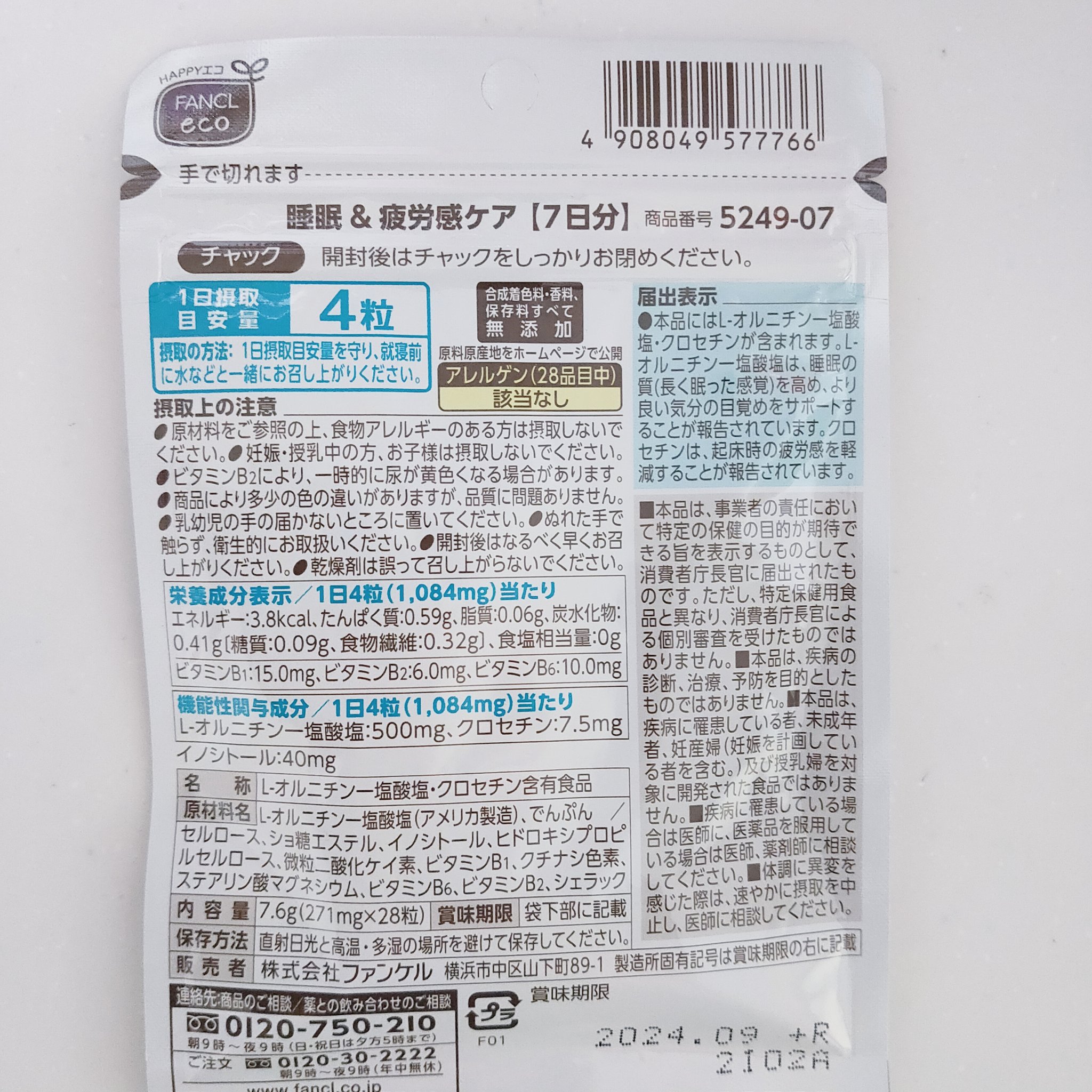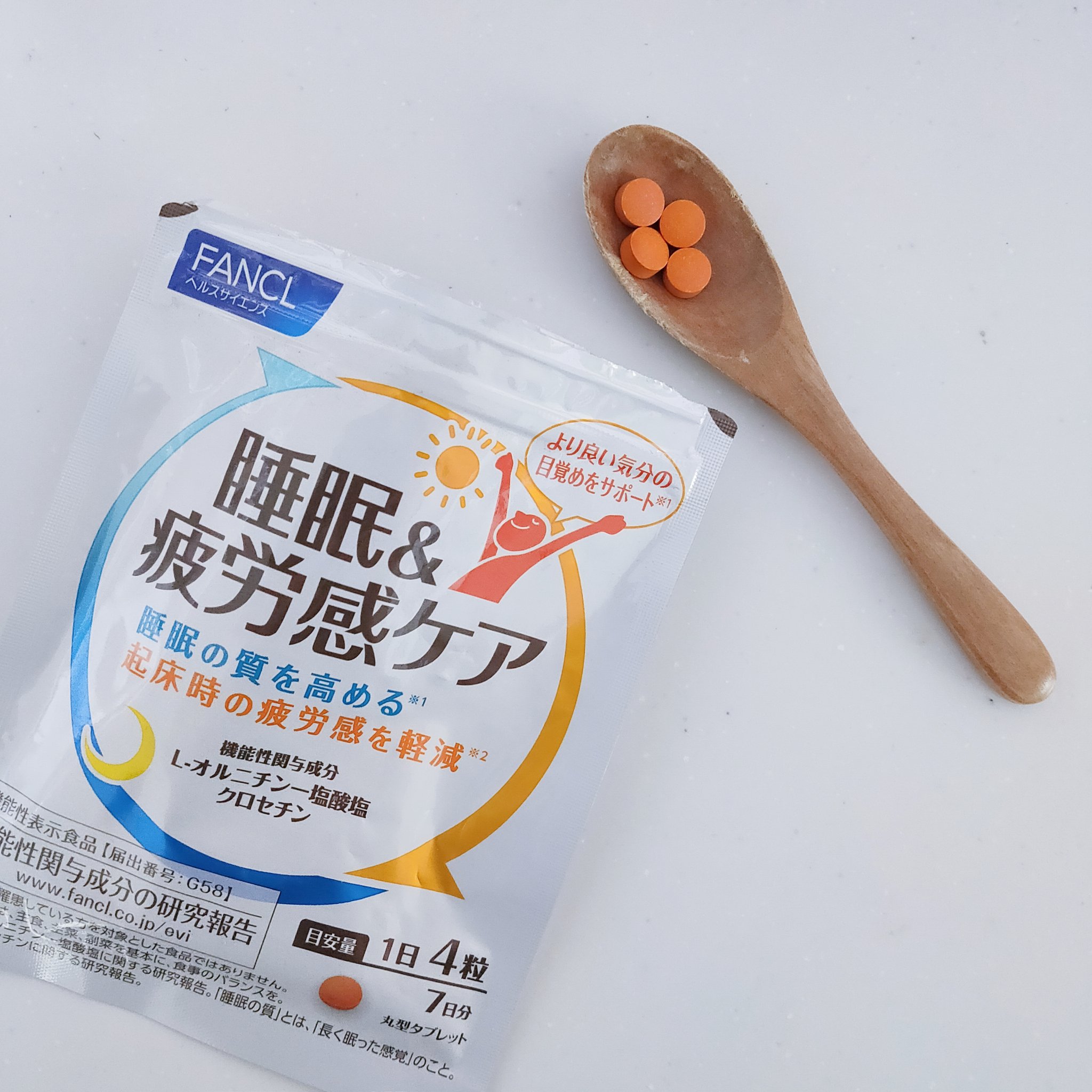 - 【機能性表示食品】朝起きた時から疲れを感じている方に。 毎日頑張る現代人には、睡眠の質を下げる要因が増えています。快活な1日のスタートのためにも、質のよい睡眠が大切です。 ファンケルの機能性表示食品「睡眠&疲労感ケア」 は、睡眠の質を高め、起床時の疲労感を軽減することが報告されたサプリメントです。 【1日の摂取目安】 4粒 【機能性関与成分/1日4粒当たり】 L-オルニチンー塩酸塩:500mg、クロセチン:7.5mg 届出表示:本品にはL-オルニチン一塩酸塩・クロセチンが含まれます。L-オルニチン一塩酸塩は、睡眠の質(長く眠った感覚)を高め、より良い気分の目覚めをサポートすることが報告されています。 クロセチンは、起床時の疲労感を軽減することが報告されています。 【その他の栄養成分/1日4粒当たり】 ビタミンB1:15.0mg、ビタミンB2:6.0mg、ビタミンB6:10.0mg 【機能性表示食品についてのご注意】 ※本品は、特定保健用食品と異なり、消費者庁長官による個別審査を受けたものではありません。 ※疾病の診断、治療、予防を目的としたものではありません。 ※食生活は、主食、主菜、副菜を基本に、食事のバランスを。 【原材料名】 L-オルニチンー塩酸塩(アメリカ製造)、でんぷん/セルロース、ショ糖エステル、イノシトール、ヒドロキシプロピルセルロース、微粒二酸化ケイ素、ビタミンB1、クチナシ色素、ステアリン酸マグネシウム、ビタミンB6、ビタミンB2、シェラック 【アレルゲン(28品目中)】 該当なし 【ご注意】 ※妊娠・授乳中の方、お子様はお召し上がりにならないでください。
