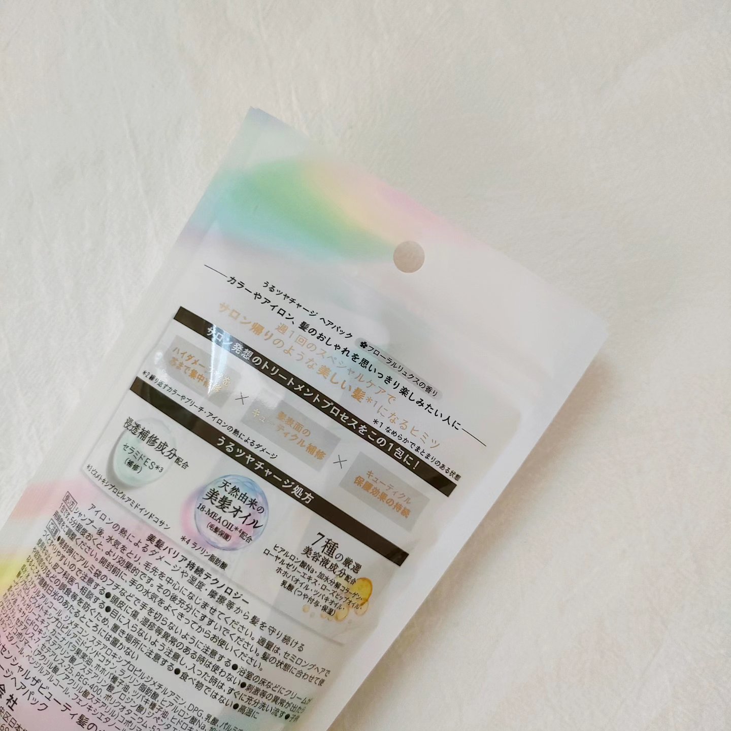 - ○カラーやアイロン、髪のおしゃれを思いっきり楽しみたい人に ○週1回のスペシャルケアで、サロン帰りのような美しい髪*へ(*なめらかでまとまりのある状態) 〇サロン発想のトリートメントプロセスがこの1包に! ○サロンのトリートメントプロセス ・ハイダメージ*を芯まで集中補修。(*繰り返すカラーやブリーチ・アイロンの熱によるダメージ) ・髪表面のキューティクルを補修 ・キューティクルの保護効果の持続 〇うるツヤチャージ処方 ・浸透補修成分配合:セラミドES*(補修)(*ビスメトキシプロピルアミドイソドコサン) ・天然由来の美髪オイル18-MEA OIL*配合(毛髪保護)(*ラノリン脂肪酸) ・7種の厳選美容液成分配合:ヒアルロン酸Na・加水分解コラーゲン・ローヤルゼリーエキス・ローズヒップオイル・ホホバホイル・ツバキオイル・乳酸(つや付与・保湿) 〇アイロン熱による髪ダメージや温度・摩擦等から髪を守り続ける”美髪バリア持続テクノロジー” 〇フローラルリュクスの香り