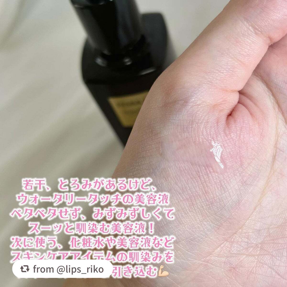 | 出した時はとろっとするのに 肌にのせると ぱしゃっとはじけるように すごくみずみずしく感じるの😇 | 詳細を見る | ||
