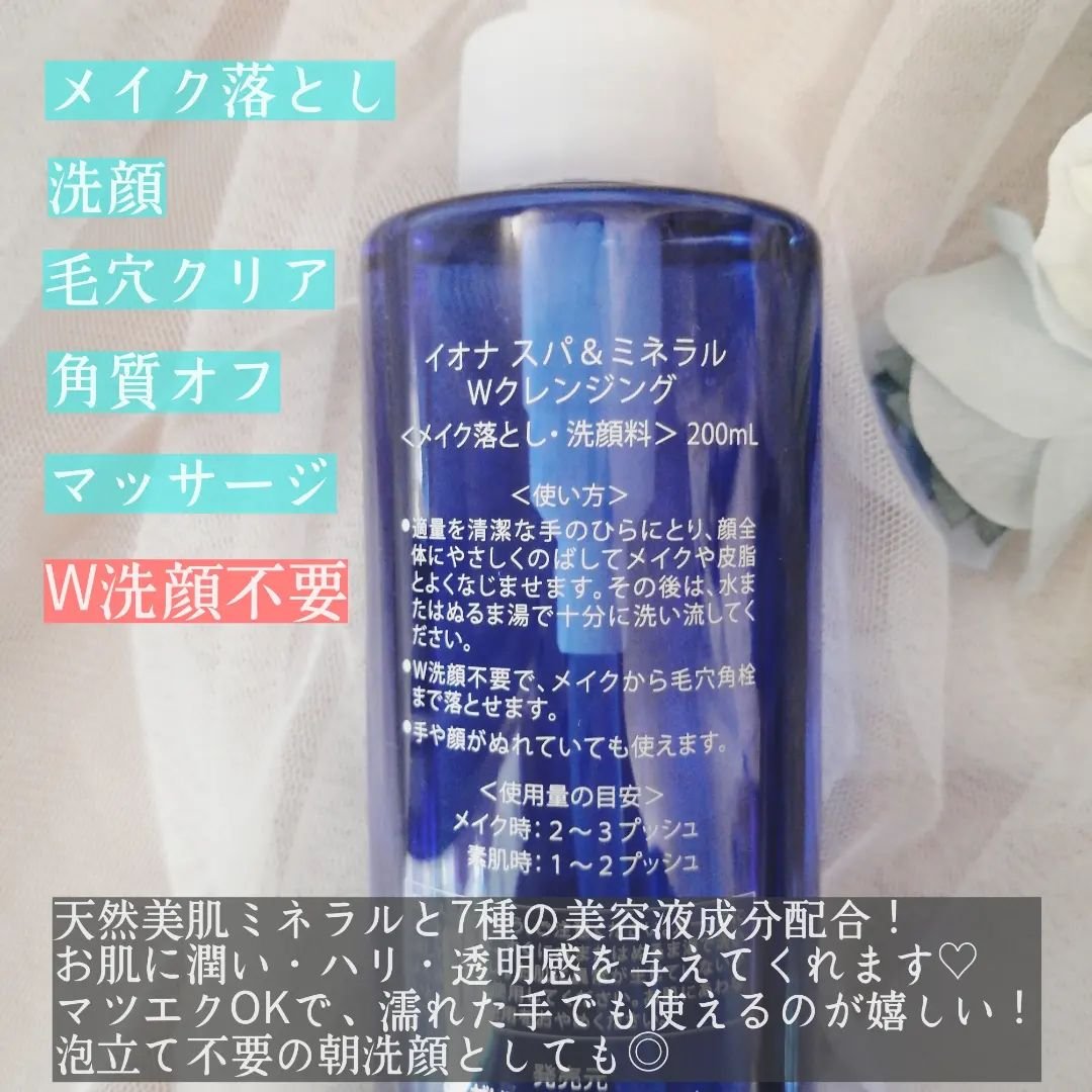 『イオナスパ&ミネラルWクレンジング』メイク落とし・洗顔料です7種類の美容液成分が入っいて優しく・しっとりすっきりな使用感が気に入っていますメイク落としとしては肌への摩擦が少なく、するりとメイクを落としてくれる感じがします洗顔料としても、マサ...