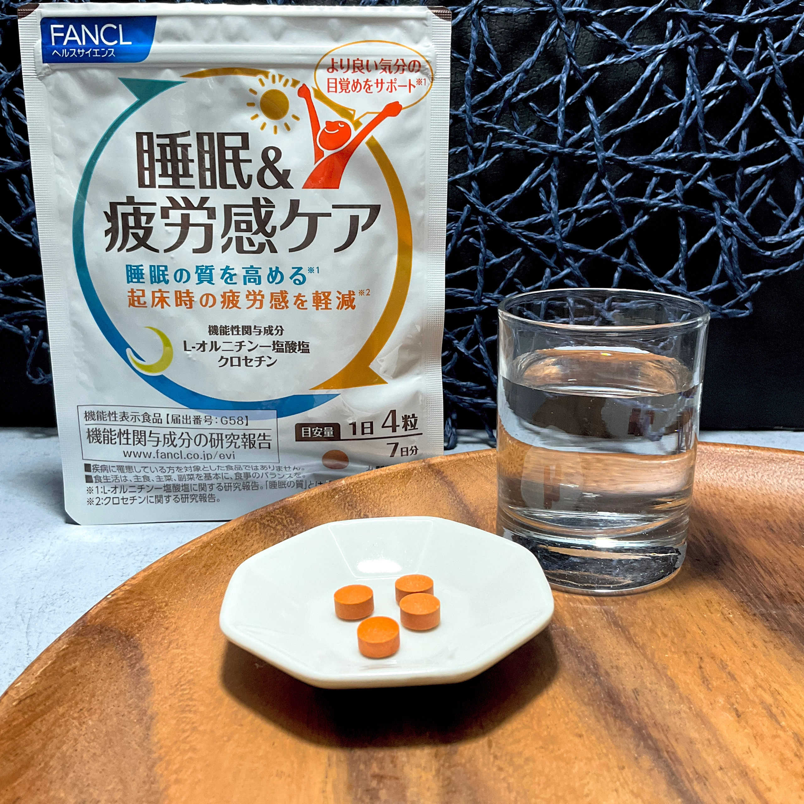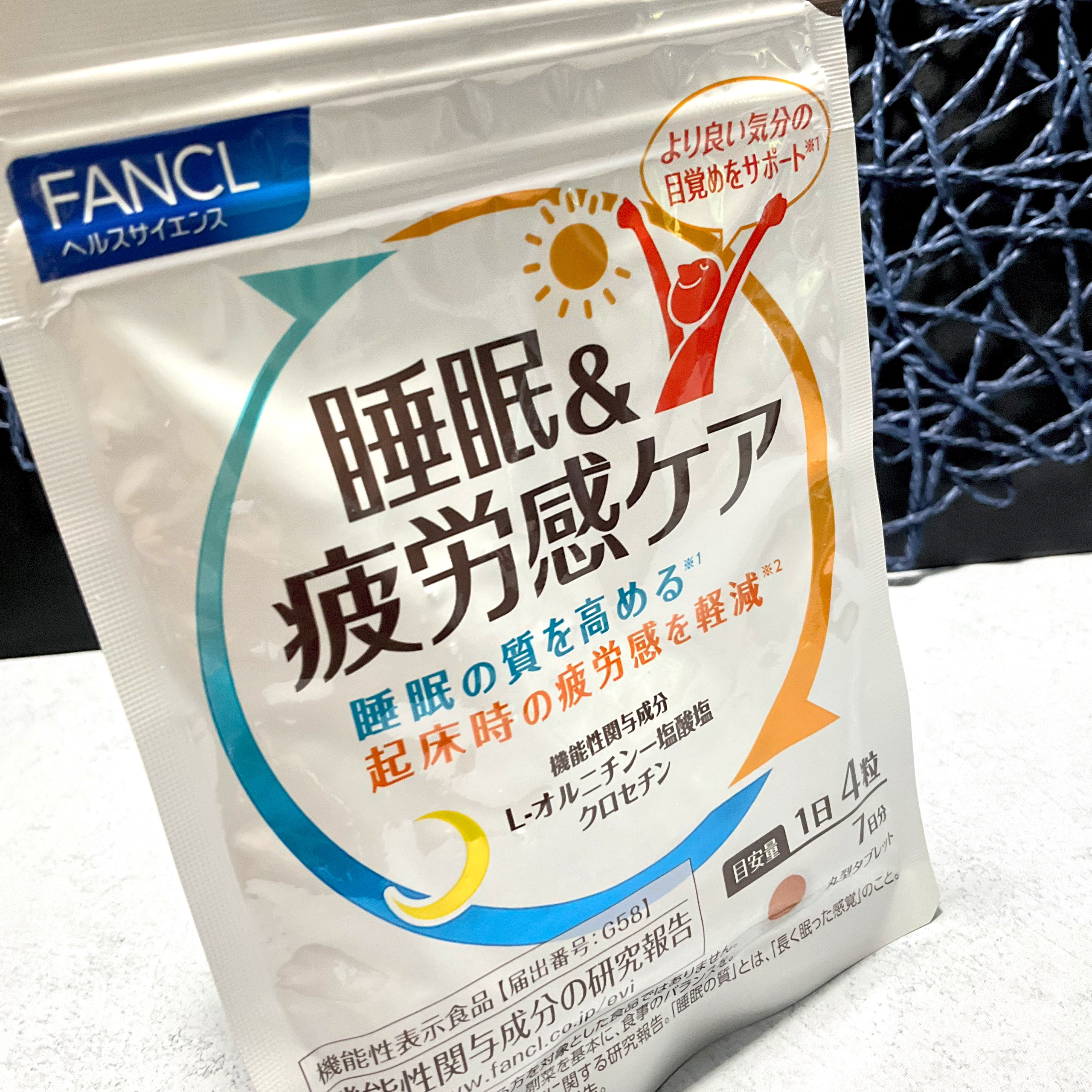 - 【機能性表示食品】朝起きた時から疲れを感じている方に。 毎日頑張る現代人には、睡眠の質を下げる要因が増えています。快活な1日のスタートのためにも、質のよい睡眠が大切です。 ファンケルの機能性表示食品「睡眠&疲労感ケア」 は、睡眠の質を高め、起床時の疲労感を軽減することが報告されたサプリメントです。 【1日の摂取目安】 4粒 【機能性関与成分/1日4粒当たり】 L-オルニチンー塩酸塩:500mg、クロセチン:7.5mg 届出表示:本品にはL-オルニチン一塩酸塩・クロセチンが含まれます。L-オルニチン一塩酸塩は、睡眠の質(長く眠った感覚)を高め、より良い気分の目覚めをサポートすることが報告されています。 クロセチンは、起床時の疲労感を軽減することが報告されています。 【その他の栄養成分/1日4粒当たり】 ビタミンB1:15.0mg、ビタミンB2:6.0mg、ビタミンB6:10.0mg 【機能性表示食品についてのご注意】 ※本品は、特定保健用食品と異なり、消費者庁長官による個別審査を受けたものではありません。 ※疾病の診断、治療、予防を目的としたものではありません。 ※食生活は、主食、主菜、副菜を基本に、食事のバランスを。 【原材料名】 L-オルニチンー塩酸塩(アメリカ製造)、でんぷん/セルロース、ショ糖エステル、イノシトール、ヒドロキシプロピルセルロース、微粒二酸化ケイ素、ビタミンB1、クチナシ色素、ステアリン酸マグネシウム、ビタミンB6、ビタミンB2、シェラック 【アレルゲン(28品目中)】 該当なし 【ご注意】 ※妊娠・授乳中の方、お子様はお召し上がりにならないでください。