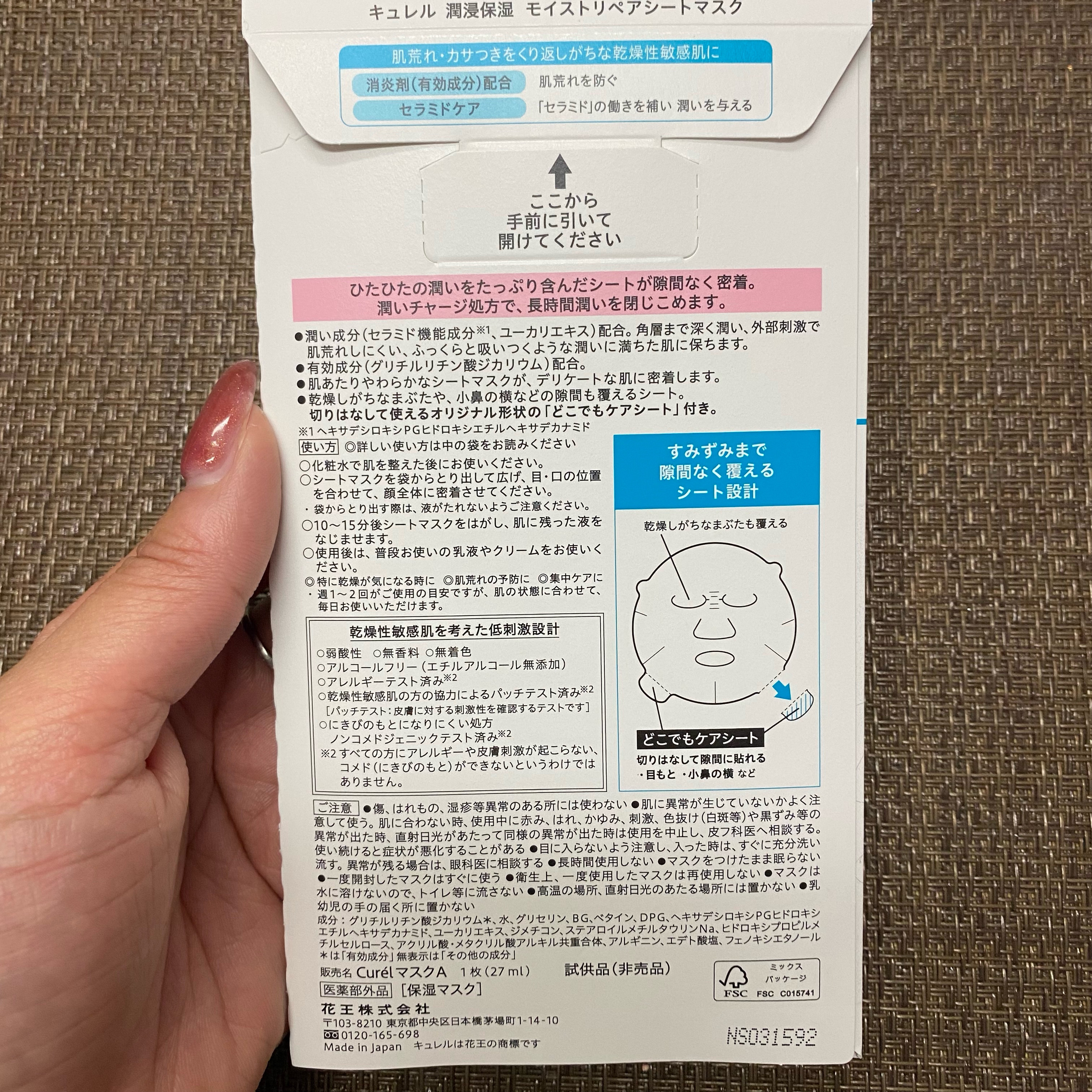 肌荒れを防ぐ消炎剤配合(有効成分) ✔️ セラミドの働きを補い、濃密な潤いをすみずみまで補給してくれるそう ✔️肌あたりやわらかなシートマスク 厚めのシートで肌あたりも良く、肌にピタッと密着してくれます。お肌が敏感な時でも優しい使い心地と、キメが整いもちっとする使用感がいいです。 マスクの下の部分は、切り離して小鼻等の隙間に貼れます。マスクのサイズによっては隙間ができるものもあるので、これも嬉しい。