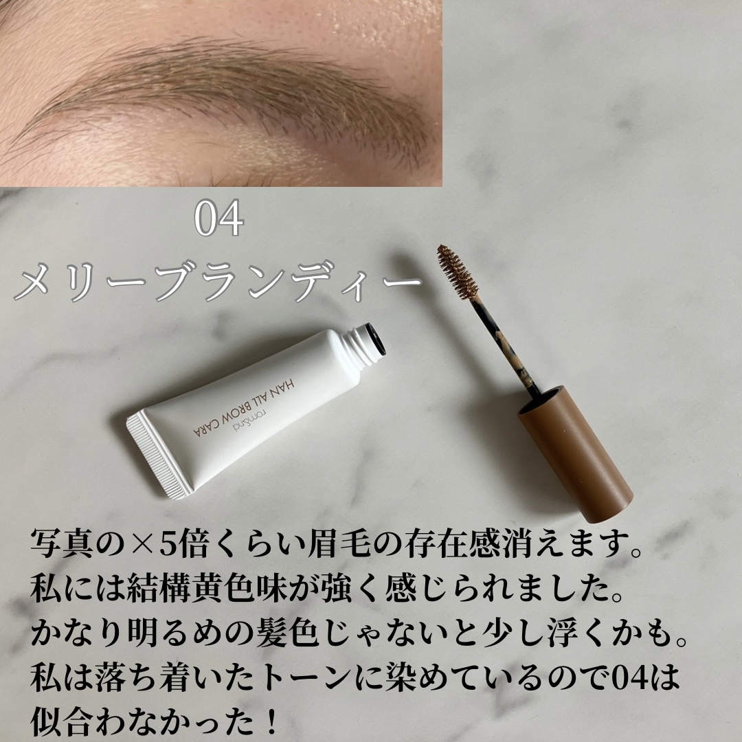 04のメリーブロンディーはかなり明るめヘアカラーの方向けかな。 私の濃ゆい眉毛ですら存在感が消されすぎてしまい… 慌てて上から別のアイブロウマスカラ塗り重ねたくらいです。 髪色に近いのは02。 落ち着いたカラーではありますが、02でも自眉毛と比べるとアイブロウマスカラだけでかなり自眉毛から変化していました。 ただ、私は眉毛の色を髪よりもう少し明るいカラーにしたいので03を一番愛用中です。 04以外は仕込むアイブロウパウダー次第でイエベ、ニュートラル、ブルベ、いずれの方も使えそうな気がします。 地肌に付きにくいという噂も本当で、確かに付きにくい!! ブラシが小さいという訳ではないのに…感動です。 8月にはブルベ向けのカラーが発売されるとのことで、そちらも今から楽しみですね😊