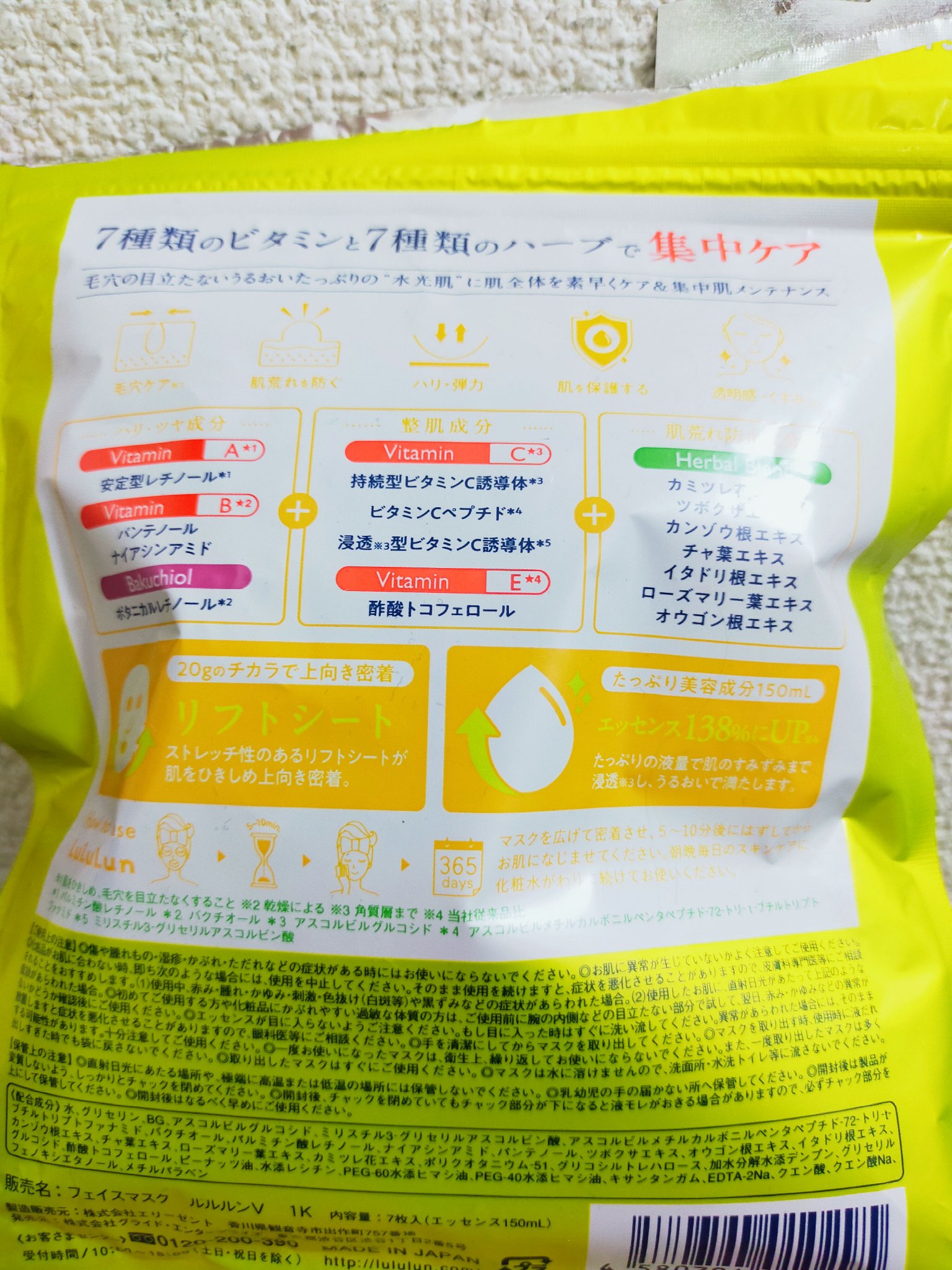 - ルルルンからビタミンたっぷりの化粧水フェイスマスクが新登場。 7種類のビタミン※1と7種類のハーブ※1で肌全体を素早くケア&集中肌メンテナンス。 新開発のフェイスラインに密着するシートで肌を引き締めながら肌のすみずみ※2までうるおいで満たし、毛穴の目立たないうるおいたっぷりの“水光肌”へ。 (※1 全て保湿成分として ※2 角質層まで)
