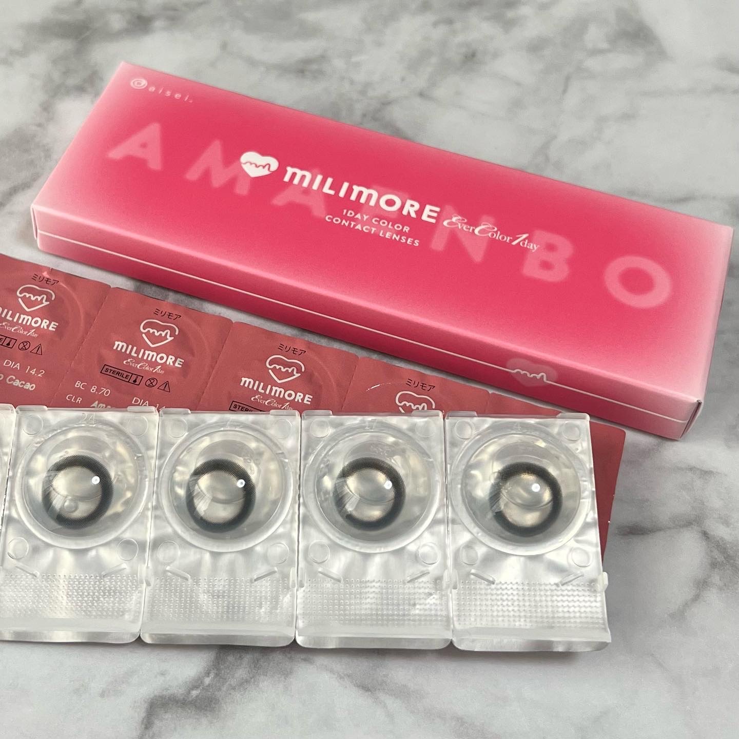 - 【商品特長】 「1mmでももっとかわいくなりたい」 エバーカラーワンデーシリーズ定番商品では初となるDIA14.2mm。 かわいさと着け心地の良さにこだわった、あざと可愛く盛れるラインナップ。 【製品スペック】 □販売名:ミリモア □装用期間:1日使い捨てタイプ □入数:1箱 10枚入 □BC:8.7mm □DIA:14.2mm □含水率:60.0% □中心厚:0.08mm(-3.00Dの場合) □PWR:±0.00( 度なし )/-0.50~-5.00( -0.25Step )/-5.50~-8.00( -0.50Step ) □承認番号:30200BZX00014A04 □製造販売元:株式会社アイレ □販売元:株式会社アイセイ カラーコンタクトレンズの不適正使用による眼障害の危険性等などがあります。 ●コンタクトレンズは高度管理医療機器です。不十分な洗浄・消毒など不適切なケアや、長時間・交換期間を超えた装用により、アレルギー性結膜炎、角膜感染症、角膜潰瘍等の重篤な眼障害が発生する危険性があります ●ご使用前に取扱説明書を確認してください 使用上の留意事項 ●眼科医院等を受診してからお求めください ●眼に異常を感じたら直ちにレンズ使用を中止し、お近くの眼科等で診察を受けてください ●医師の指示にしたがってご使用ください ●コンタクトレンズを装用する場合、自覚症状がなくても、眼科医院等での定期検査を受けてください ●レンズに不具合がある場合は使用しないでください