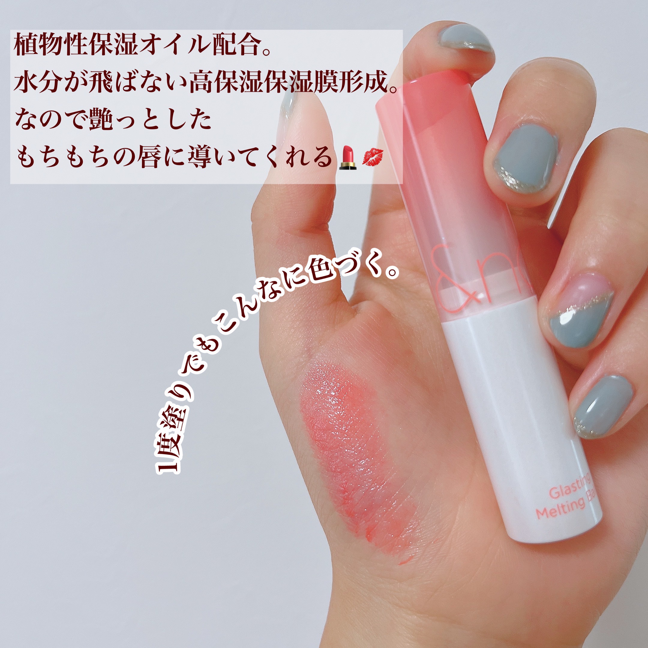 - もちっとした水膜で弾けそうなツヤリップ 1.軽い塗り心地のなめらかで透明な水爆弾ツヤ 2.塗った瞬間から唇を鮮やかに彩る多彩なカラーバーム 3.植物性保湿オイルでしっとりもっちり保湿バーム