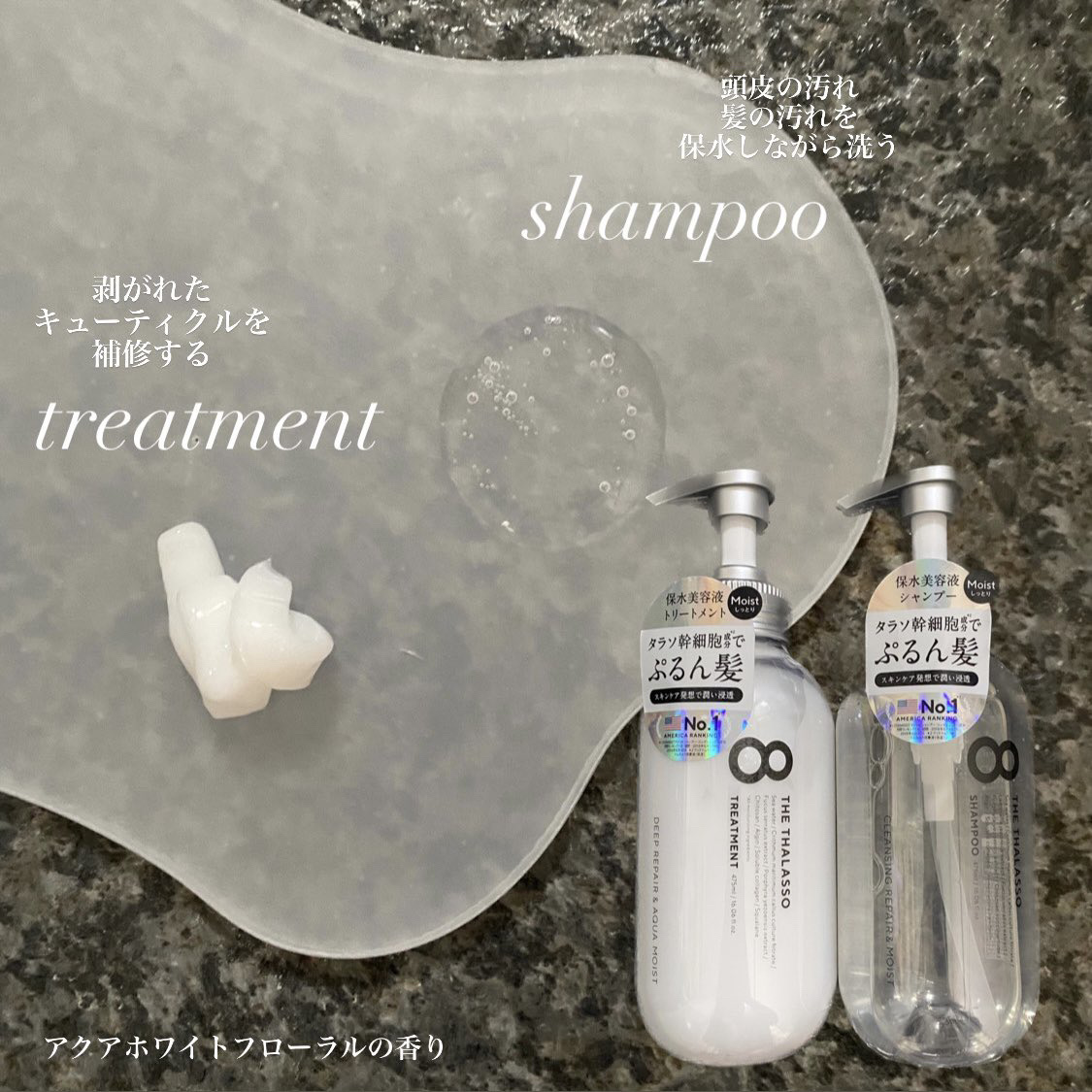 地肌を保水しながら美容液で洗ってエイジングケアが同時に叶う。 3種の幹細胞エキス(潤い)と、海藻エキス(潤い)などを贅沢に配合した「タラソ幹細胞処方」の美容液シャンプー。 アクアホワイトフローラルの香り、今まで使ったシャンプーの中で一番好きな香りでした (ˊᗜˋ*)/ 洗った翌朝に保水されてるのが分かる感じ。 冬場は特に乾燥するのに、静電気が起きにくくなって助かってます。