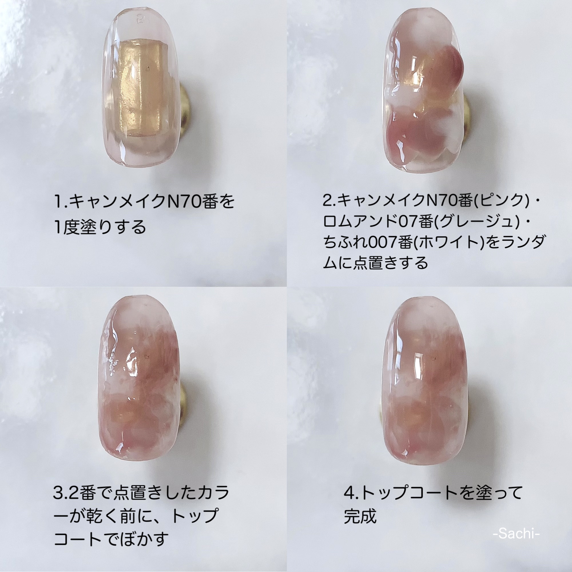 ワンカラーでも指ごとに色を変えるだけでオシャレに見えます💕 画像のようにゴールドラインとストーンを少し足すだけで華やかさがアップ🥰 何度かご紹介したことのあるスポンジで作るグラデーションです✨ スポンジを使うことで境目が綺麗に馴染んでくれます💕 アルミホイルの上でブラウンとトップコートを1:1くらいで混ぜたものを、トップコートのハケに取って3箇所に塗るだけ👌 事前に混ぜたものを塗ることで、爪の上でぼかすより簡単に出来ます💕 ベースカラーが乾く前に点置きしてぼかすことで綺麗にぼかせます✨ スピードが大事なので、使うポリッシュのキャップは全て開けておきましょう😊 天然石のラインはガタガタの方がより天然石っぽく見えるので、ラインを描くのが苦手な方でも大丈夫🙆♀️ 難しそうに見えて、やってみると意外と簡単に出来ます♡