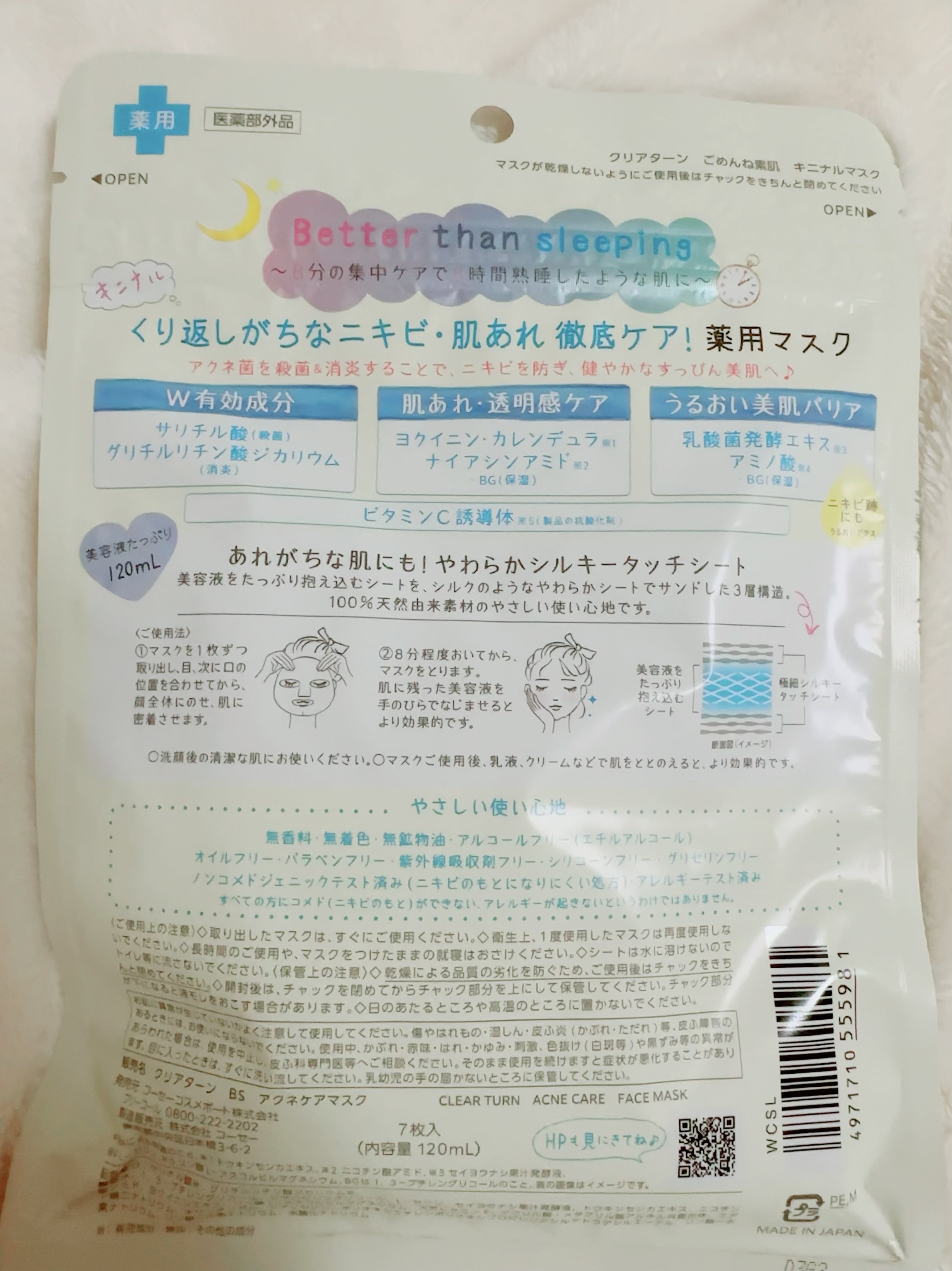 - くり返しがちなニキビ・肌あれ 徹底予防ケア!薬用マスク ①アクネ菌を殺菌&消炎することで、ニキビを防ぎ、健やかなすっぴん肌へ♪ W有効成分:サリチル酸(殺菌)・グリチルリチン酸ジカリウム(消炎) 肌あれ予防・透明感ケア:ヨクイニン・カレンデュラ※1・ナイアシンアミド※2・BG(保湿) うるおい美肌バリア:乳酸菌発酵エキス※3・アミノ酸※4・BG(保湿) ビタミンC誘導体※5(製品の抗酸化剤) ②あれがちな肌にも使える、やさしい使い心地 無香料・無着色・無鉱物油・アルコールフリー(エチルアルコール)・オイルフリー ・パラベンフリー・紫外線吸収剤フリー・シリコーンフリー・グリセリンフリー ノンコメドジェニックテスト済み(ニキビのもとになりにくい処方)・アレルギーテスト済み すべての方にコメド(ニキビのもと)ができない、アレルギーが起きないわけではありません ③やわらかシルキータッチシート 美容液をたっぷり抱え込むシートを、シルクのような柔らかいシートでサンドした3層構造シート。 ※1トウキンセンカエキス ※2 ニコチン酸アミド ※3セイヨウナシ果汁発酵液 ※4L-セリン ※5 リン酸L-アスコルビルマグネシウム、BGは1、3-ブチレングリコールのこと