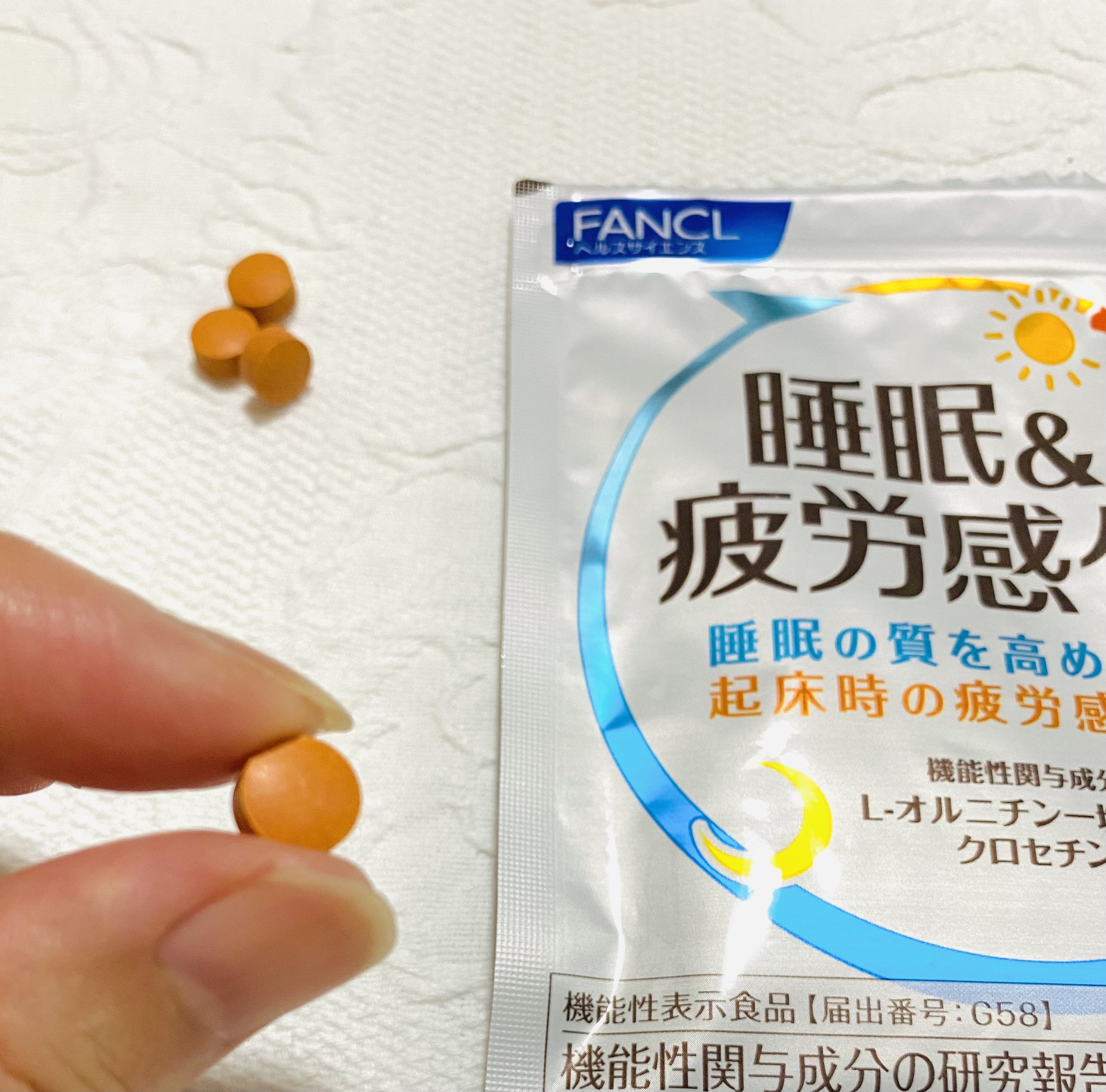 - 【機能性表示食品】朝起きた時から疲れを感じている方に。 毎日頑張る現代人には、睡眠の質を下げる要因が増えています。快活な1日のスタートのためにも、質のよい睡眠が大切です。 ファンケルの機能性表示食品「睡眠&疲労感ケア」 は、睡眠の質を高め、起床時の疲労感を軽減することが報告されたサプリメントです。 【1日の摂取目安】 4粒 【機能性関与成分/1日4粒当たり】 L-オルニチンー塩酸塩:500mg、クロセチン:7.5mg 届出表示:本品にはL-オルニチン一塩酸塩・クロセチンが含まれます。L-オルニチン一塩酸塩は、睡眠の質(長く眠った感覚)を高め、より良い気分の目覚めをサポートすることが報告されています。 クロセチンは、起床時の疲労感を軽減することが報告されています。 【その他の栄養成分/1日4粒当たり】 ビタミンB1:15.0mg、ビタミンB2:6.0mg、ビタミンB6:10.0mg 【機能性表示食品についてのご注意】 ※本品は、特定保健用食品と異なり、消費者庁長官による個別審査を受けたものではありません。 ※疾病の診断、治療、予防を目的としたものではありません。 ※食生活は、主食、主菜、副菜を基本に、食事のバランスを。 【原材料名】 L-オルニチンー塩酸塩(アメリカ製造)、でんぷん/セルロース、ショ糖エステル、イノシトール、ヒドロキシプロピルセルロース、微粒二酸化ケイ素、ビタミンB1、クチナシ色素、ステアリン酸マグネシウム、ビタミンB6、ビタミンB2、シェラック 【アレルゲン(28品目中)】 該当なし 【ご注意】 ※妊娠・授乳中の方、お子様はお召し上がりにならないでください。