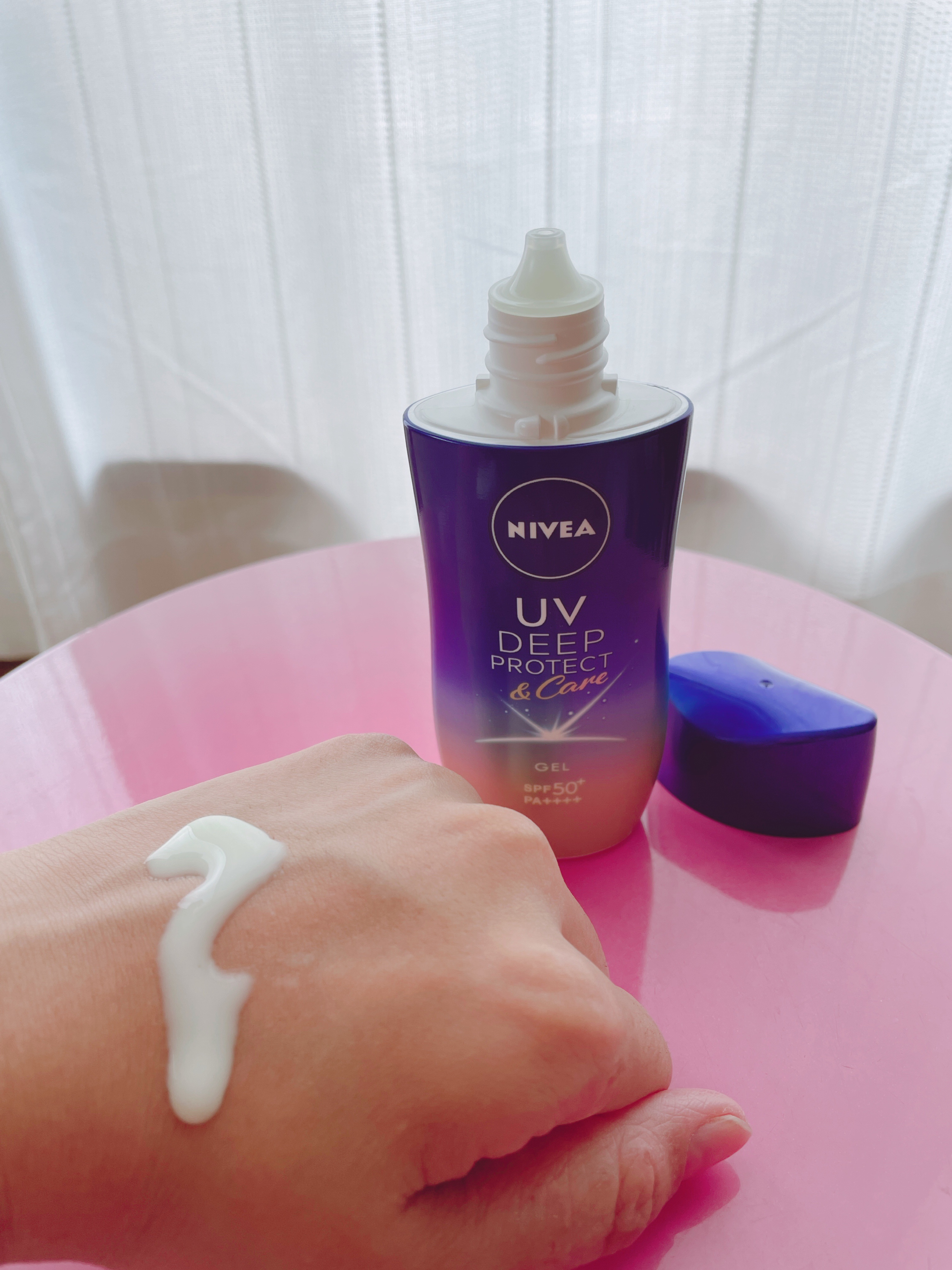 リニューアルした「ニベアUV ディーププロテクト&ケア ジェル」は、全身にたっぷり使えるのびの良いジェルで、肌にムラなく伸ばせます。 みずみずしいテクスチャーで、軽いつけ心地です。べたつきにくく、肌に塗りやすいです。 SPF50+・PA++++・UV耐水性★★なので、これから汗をかくことの多い時期にもぴったりですね♪
