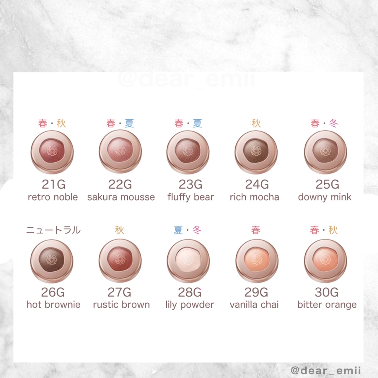 - <01G twinkle sand> シクロメチコン、合成フルオロフロゴパイト、ジフェニルジメチコン、(ジメチコン/ビニルジメチコン)クロスポリマー、イソドデカン、トリメチルシロキシケイ酸、ジメチコン、アストロカリウムムルムル種子脂、ゼニアオイエキス、ダマスクバラ花エキス、トコフェロール、マツリカ花エキス、レモン果実エキス、BG、BHT、TEA、(HDI/トリメチロールヘキシルラクトン)クロスポリマー、イソステアリン酸デキストリン、エタノール、エチルヘキサン酸セチル、キサンタンガム、シリカ、ジメチルシリル化シリカ、スクワラン、ステアリン酸イヌリン、セルロース、テトラ(ジ-t-ブチルヒドロキシヒドロケイヒ酸)ペンタエリスリチル、トリ(カプリル酸/カプリン酸)グリセリル、トリイソステアリン酸イソプロピルチタン、トリエチルヘキサノイン、ハイドロゲンジメチコン、ポリプロピレン、ミネラルオイル、合成ワックス、酸化スズ、水、水酸化Al、水添ポリ(C6-20オレフィン)、水添レシチン、麻セルロース、フェノキシエタノール、香料、オキシ塩化ビスマス、グンジョウ、マイカ、酸化チタン、酸化鉄 <02G dizzy mirage> 合成フルオロフロゴパイト、シクロメチコン、ジフェニルジメチコン、(ジメチコン/ビニルジメチコン)クロスポリマー、イソドデカン、トリメチルシロキシケイ酸、ジメチコン、アストロカリウムムルムル種子脂、ゼニアオイエキス、ダマスクバラ花エキス、トコフェロール、マツリカ花エキス、レモン果実エキス、BG、BHT、TEA、(HDI/トリメチロールヘキシルラクトン)クロスポリマー、イソステアリン酸デキストリン、エタノール、エチルヘキサン酸セチル、キサンタンガム、シリカ、ジメチルシリル化シリカ、スクワラン、ステアリン酸イヌリン、セルロース、テトラ(ジ-t-ブチルヒドロキシヒドロケイヒ酸)ペンタエリスリチル、トリ(カプリル酸/カプリン酸)グリセリル、トリイソステアリン酸イソプロピルチタン、トリエチルヘキサノイン、ハイドロゲンジメチコン、ポリプロピレン、ミネラルオイル、合成ワックス、酸化スズ、水、水酸化Al、水添ポリ(C6-20オレフィン)、水添レシチン、麻セルロース、フェノキシエタノール、香料、オキシ塩化ビスマス、グンジョウ、マイカ、酸化チタン、酸化鉄 <03G romantic crush> 合成フルオロフロゴパイト、シクロメチコン、ジフェニルジメチコン、(ジメチコン/ビニルジメチコン)クロスポリマー、イソドデカン、トリメチルシロキシケイ酸、ジメチコン、ホウケイ酸(Ca/Al)、アストロカリウムムルムル種子脂、ゼニアオイエキス、ダマスクバラ花エキス、トコフェロール、マツリカ花エキス、レモン果実エキス、BG、BHT、TEA、(HDI/トリメチロールヘキシルラクトン)クロスポリマー、イソステアリン酸デキストリン、エタノール、エチルヘキサン酸セチル、キサンタンガム、シリカ、ジメチルシリル化シリカ、スクワラン、ステアリン酸イヌリン、セルロース、テトラ(ジ-t-ブチルヒドロキシヒドロケイヒ酸)ペンタエリスリチル、トリ(カプリル酸/カプリン酸)グリセリル、トリイソステアリン酸イソプロピルチタン、トリエチルヘキサノイン、トリエトキシカプリリルシラン、ハイドロゲンジメチコン、ポリプロピレン、ミネラルオイル、合成ワックス、酸化スズ、水、水酸化Al、水添ポリ(C6-20オレフィン)、水添レシチン、麻セルロース、フェノキシエタノール、香料、オキシ塩化ビスマス、グンジョウ、マイカ、酸化チタン、酸化鉄 <04G gold glint> 合成フルオロフロゴパイト、シクロメチコン、ジフェニルジメチコン、(ジメチコン/ビニルジメチコン)クロスポリマー、イソドデカン、トリメチルシロキシケイ酸、ジメチコン、ホウケイ酸(Ca/Al)、アストロカリウムムルムル種子脂、ゼニアオイエキス、ダマスクバラ花エキス、トコフェロール、マツリカ花エキス、レモン果実エキス、BG、BHT、TEA、(HDI/トリメチロールヘキシルラクトン)クロスポリマー、イソステアリン酸デキストリン、エタノール、エチルヘキサン酸セチル、キサンタンガム、シリカ、ジメチルシリル化シリカ、スクワラン、ステアリン酸イヌリン、セルロース、テトラ(ジ-t-ブチルヒドロキシヒドロケイヒ酸)ペンタエリスリチル、トリ(カプリル酸/カプリン酸)グリセリル、トリイソステアリン酸イソプロピルチタン、トリエチルヘキサノイン、ハイドロゲンジメチコン、ポリプロピレン、ミネラルオイル、ラウリン酸亜鉛、合成ワックス、酸化スズ、水、水酸化Al、水添ポリ(C6-20オレフィン)、水添レシチン、麻セルロース、フェノキシエタノール、香料、オキシ塩化ビスマス、グンジョウ、マイカ、酸化チタン、酸化鉄 <05G peach bloom> シクロメチコン、合成フルオロフロゴパイト、ジフェニルジメチコン、(ジメチコン/ビニルジメチコン)クロスポリマー、イソドデカン、トリメチルシロキシケイ酸、ジメチコン、アストロカリウムムルムル種子脂、ゼニアオイエキス、ダマスクバラ花エキス、トコフェロール、マ