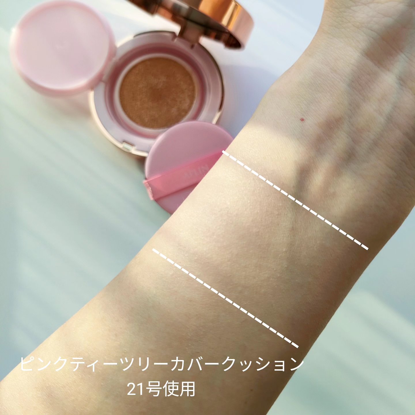 APLIN ピンクティーツリーカバークッション 21号ライトベージュ 2,490円(税込) 少量でよく伸びてハイカバー! 赤みやくすみをしっかりカバ一できるのに、厚塗り感のないなめらかな仕上がり♡ ハイカバーなのにナチュラルなツヤ感とサラッとしつつ、乾燥崩れしにくい仕上がりに感動します!!