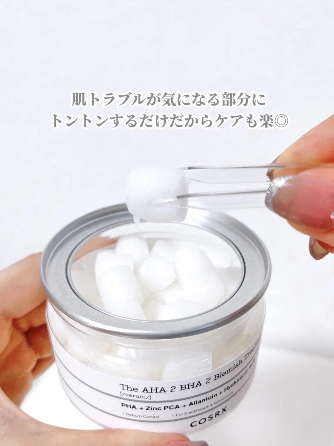 AHA・BHA高濃度処方で迅速なトラブルケアができるアイテムです🥺 肌トラブルが気になる部分にトントンするだけだからケアも楽◎ コットンボールにはたっぷりの美容液が含まれていました✨ ピンセット付きだから衛生的だし、肌トラブル部分に直接触れることなくケアできるよ🙌 集中ケアが必要なトラブル部位に正確に塗布できて、即効性のあるトラブルケアにもってこいです☘️ 私はニキビできたところにトントンしてる🙆♀️◎ ニキビの治りもいつもより早い気がします✨