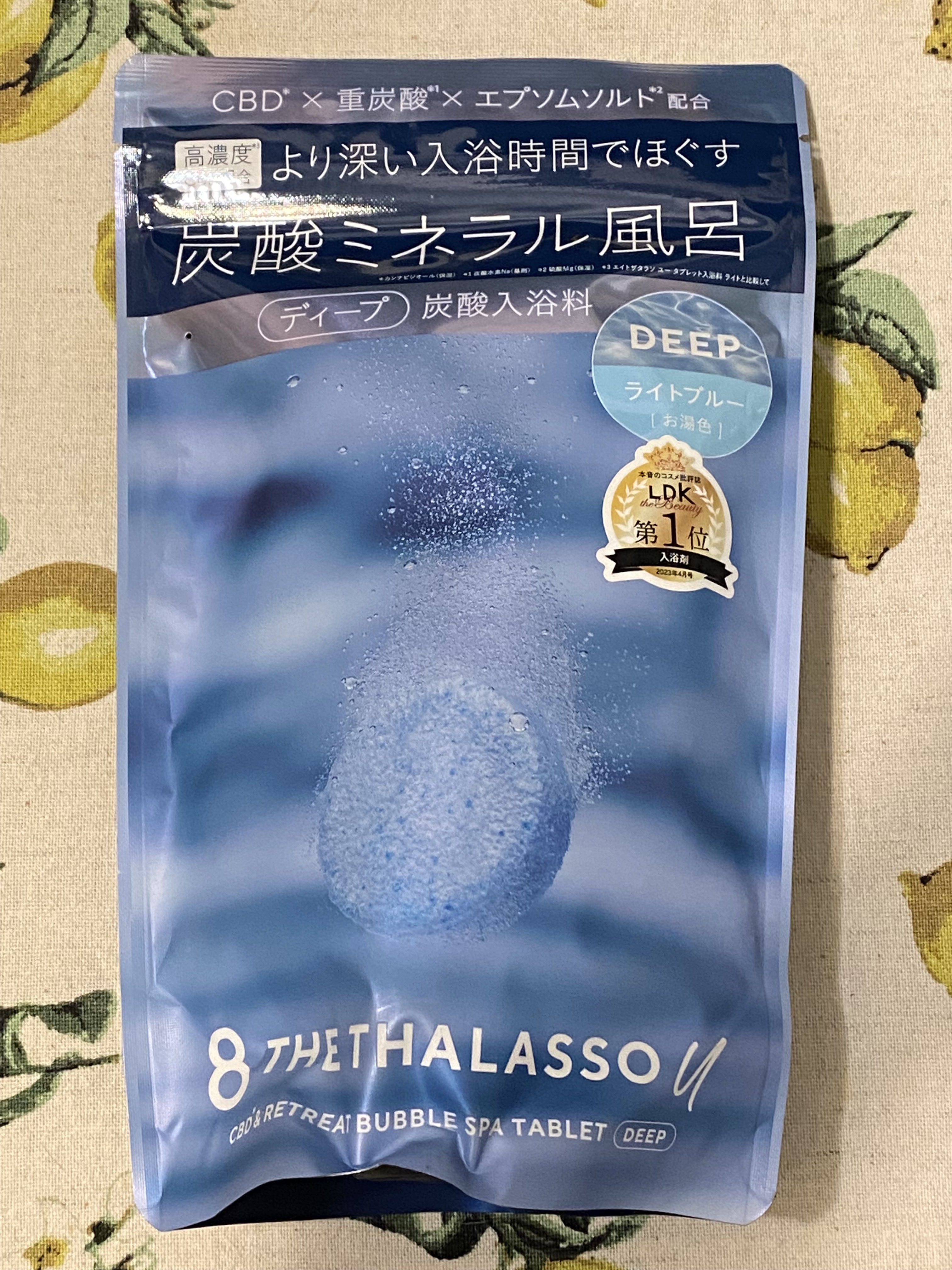 - スキンケア発想!自宅で炭酸スパが楽しめる、「CBD*1×重炭酸*2×エプソムソルト*3」配合のタブレット入浴料。海の恵みを凝縮した重炭酸*2スパで芯までじんわり温かく。さらに、柔らかくなめらかなお湯がカラダをやさしく包み込み、肌の潤いを保ちながら健やかに整えます。「ディープ」タイプは、CBD*1を高濃度*4配合!より深い安らぎの温浴タイムをお楽しみいただけます。ライトブルーのお湯色。ムスキーサボンの香り。 *1 カンナビジオール *2 炭酸水素Na(基剤) *3 硫酸Mg(保湿) *4 エイトザタラソ ユー タブレット入浴料 ライトと比較して