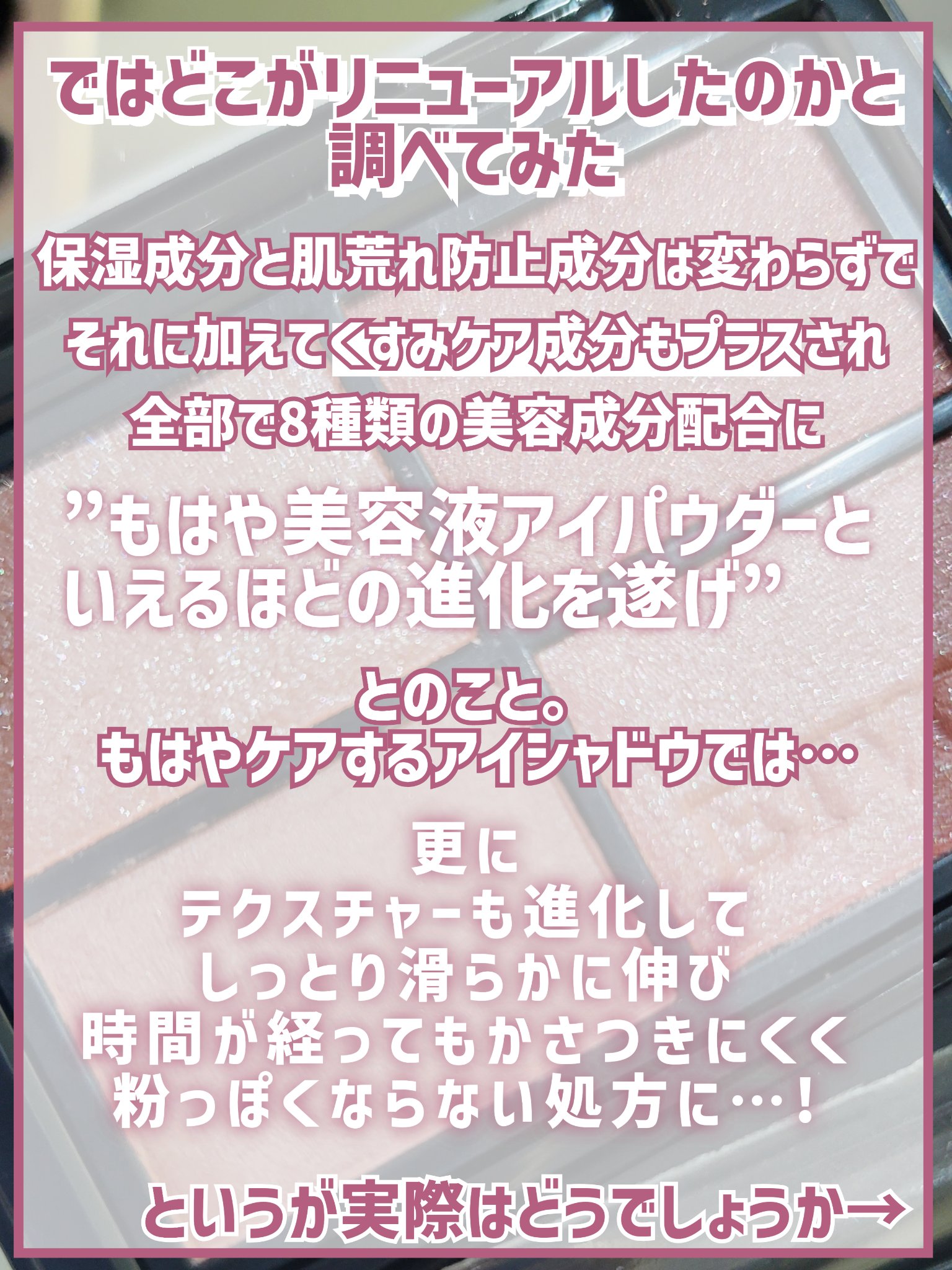 全体のローズ感と粉質もたまらなくいいんですが 左下のハイライトカラー?パールの粉が すんごい涙袋にいいんですよ… パーンとめちゃくちゃ涙袋盛れるけど、 ほんのりピンクがかった白みベージュなので 平成ギャルみたいになるわけではない…と思う ほんとこのハイライトカラーが涙袋に良すぎて いつかここだけ底見えする説…